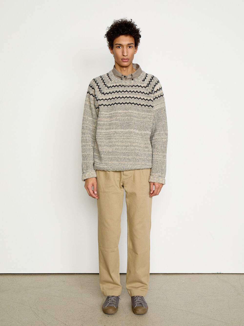 Three different yarn colors are twisted together and knitted, creating a unique pattern and tonal variation for each piece. Unlike conventional jacquard knits, this technique ensures that every garment carries its own individuality.