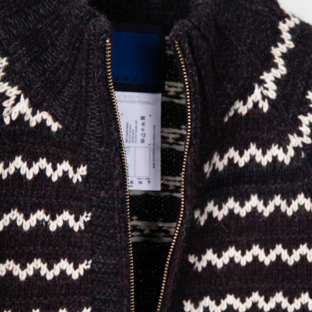 패턴은 핀란드의 전통적인 노르딕 패턴에서 영감을 받아 도큐먼트만의 방식으로 재해석했습니다. 어깨와 가슴 부분에 반복되는 그래픽적 짜임이 특징이며, 세 가지 컬러의 원사를 교차해 꼬아 편직하여 각 피스마다 고유한 패턴과 질감이 만들어집니다. 이는 기계적 반복에서 벗어나, 착용자마다 다른 개성을 드러내는 특별한 디테일입니다.