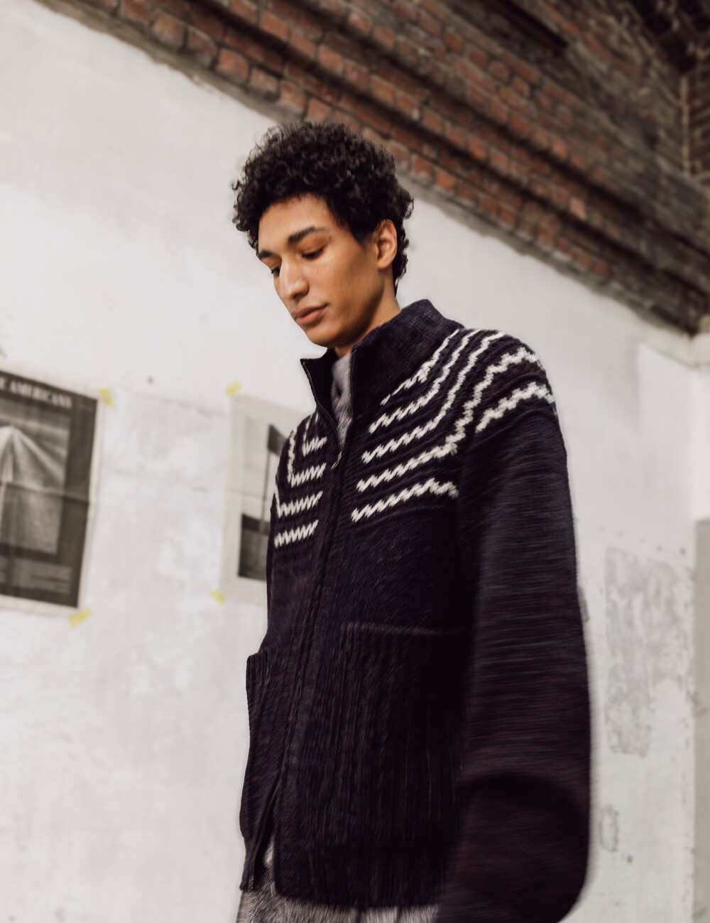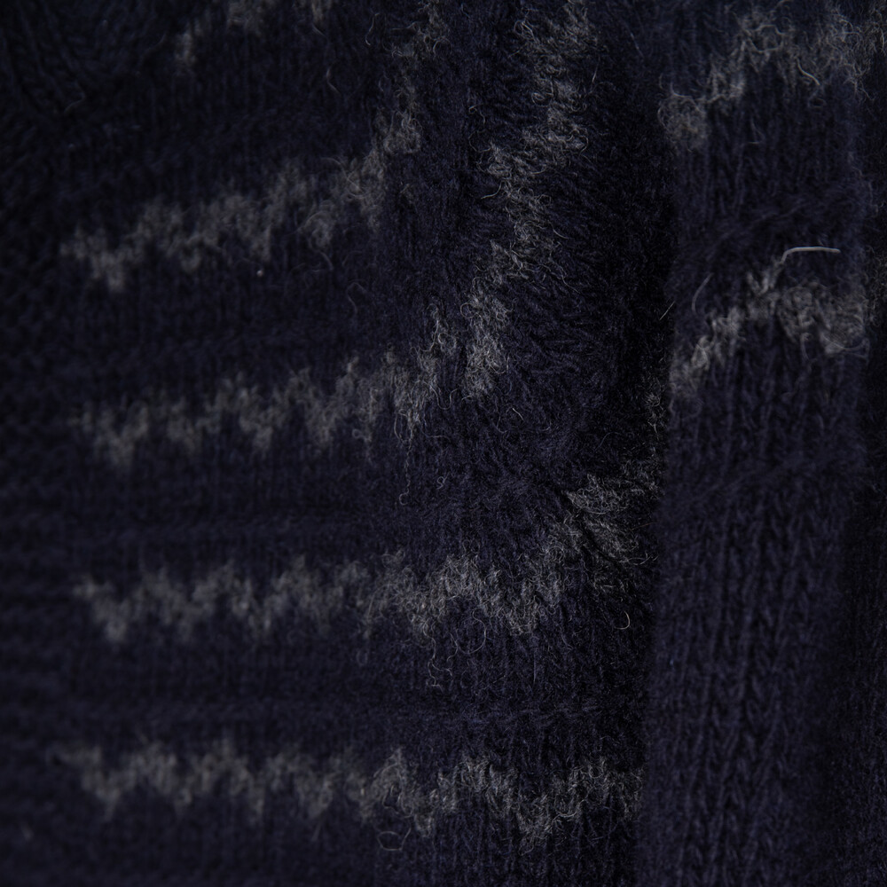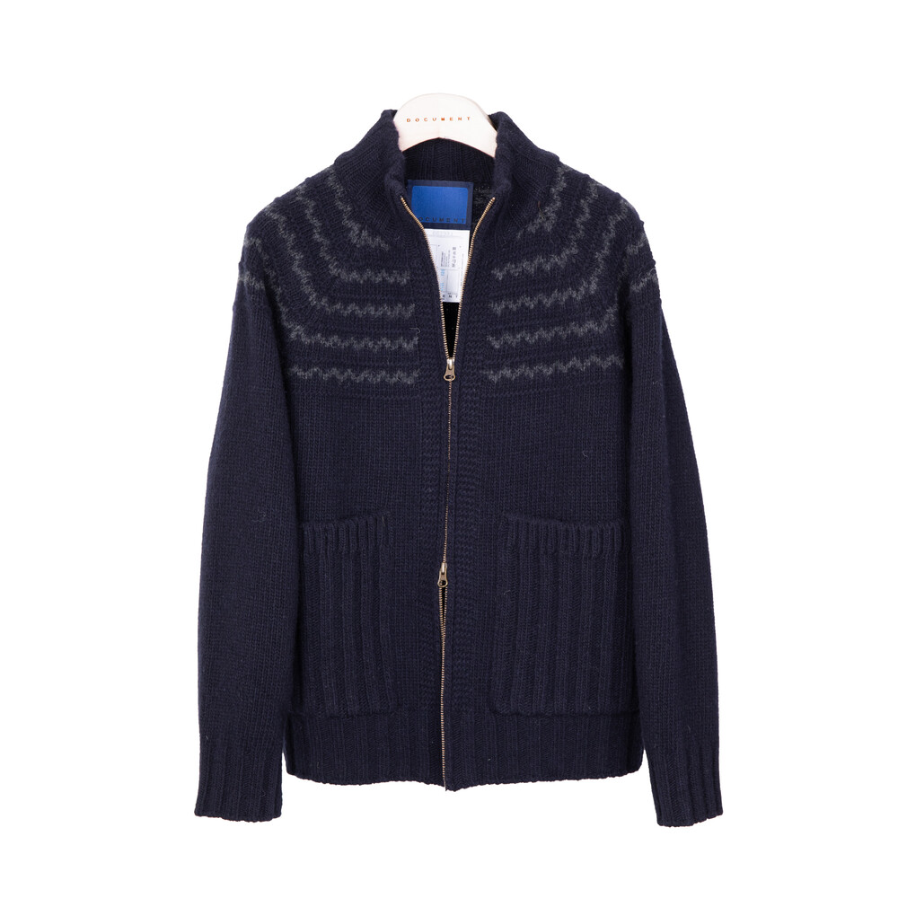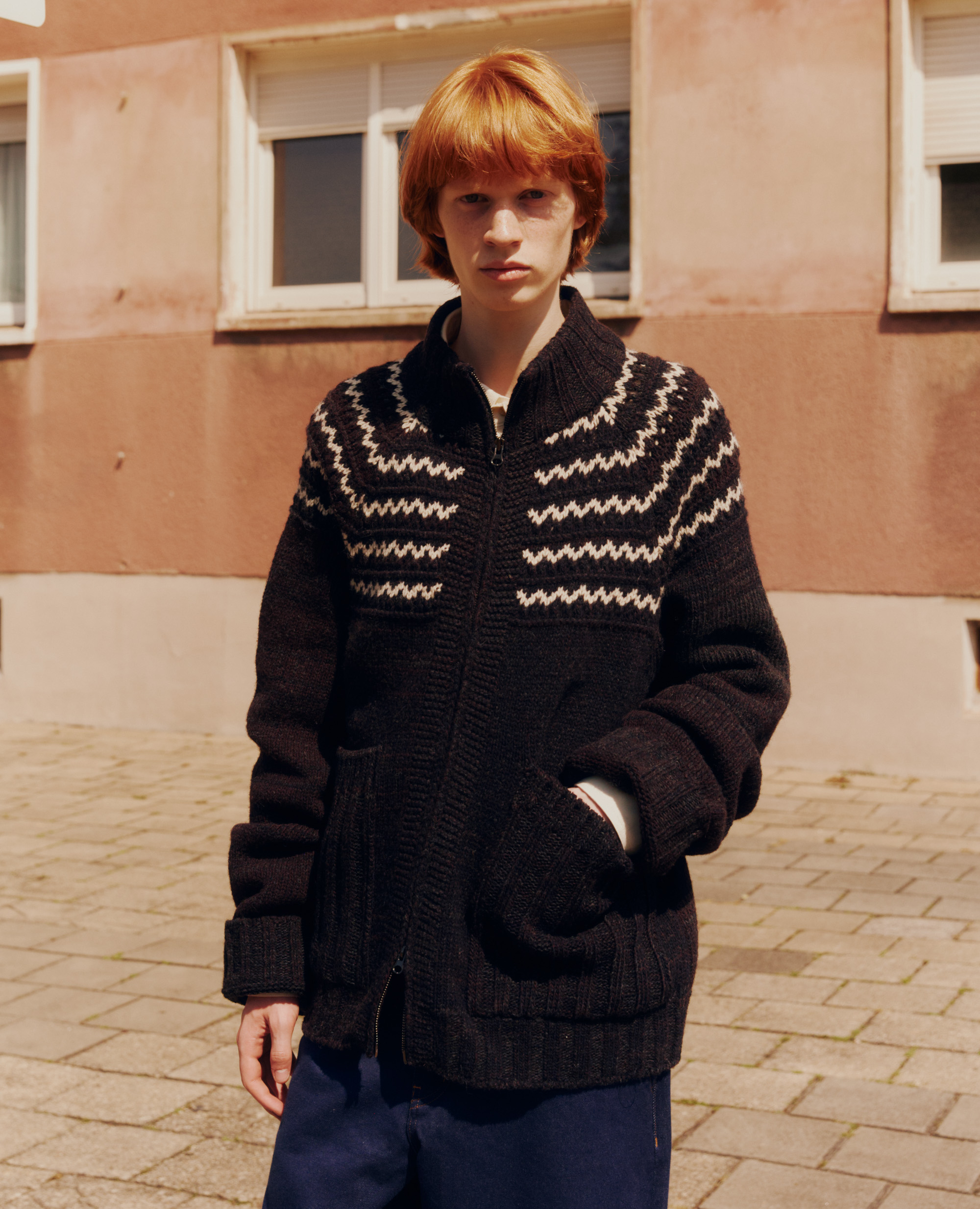 The design is inspired by Nordic patterns from Finland, reinterpreted through Document’s perspective. The jacquard motif across the chest and shoulders stands out, while the fabric itself is knitted by twisting three different colored yarns together. This unique method results in subtle variations in pattern and texture for each piece, ensuring that no two sweaters are exactly alike.