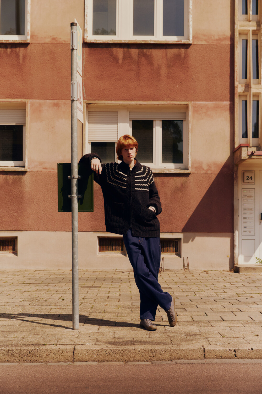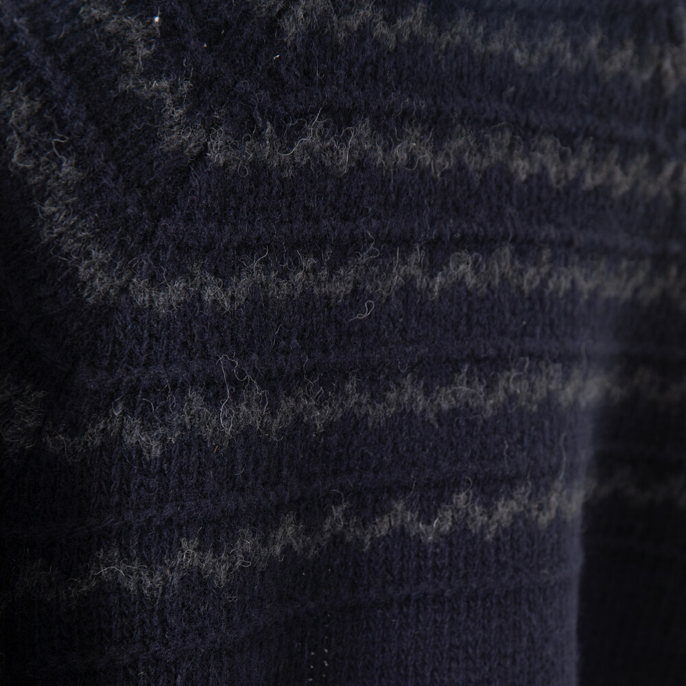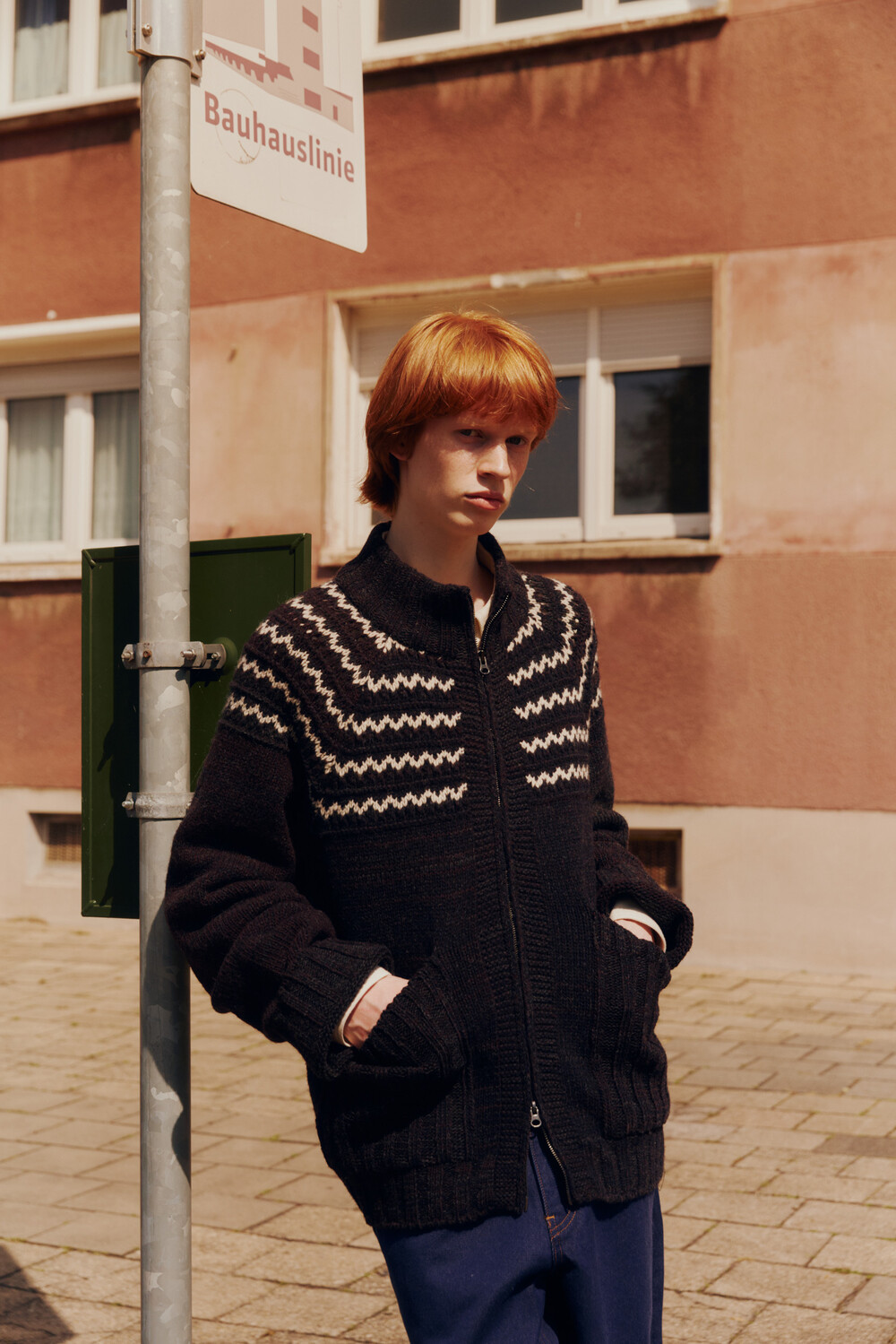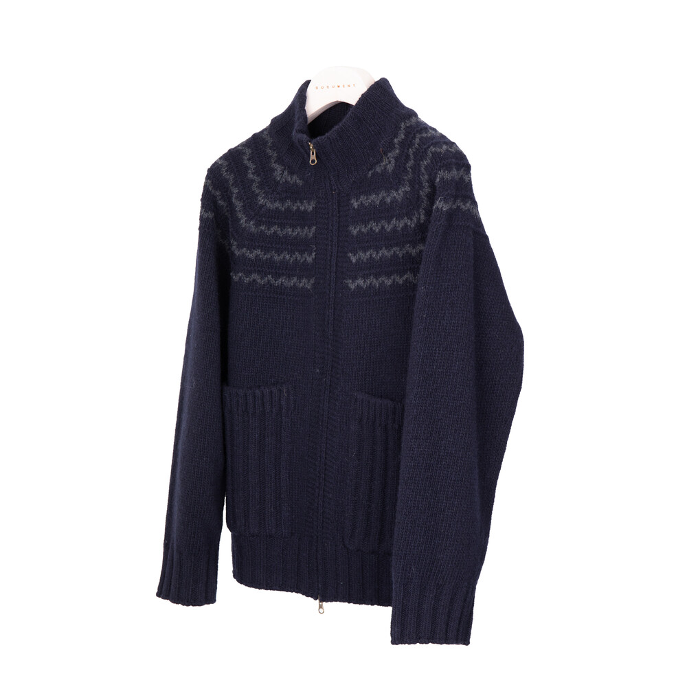 The design is inspired by Nordic patterns from Finland, reinterpreted through Document’s perspective. The jacquard motif across the chest and shoulders stands out, while the fabric itself is knitted by twisting three different colored yarns together. This unique method results in subtle variations in pattern and texture for each piece, ensuring that no two sweaters are exactly alike.