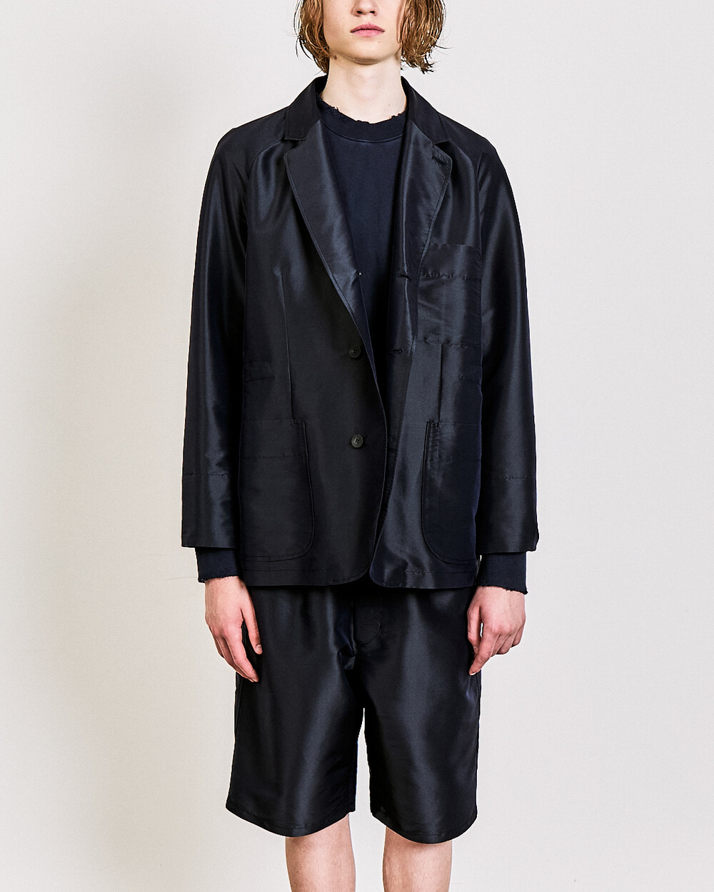 Made from an original Japanese fabric in 70% polyester and 30% silk, the material combines the subtle sheen of silk with the strength and stability of polyester. It feels soft and elegant in appearance, yet maintains a composed structure—capturing a quiet balance of softness and resilience.
