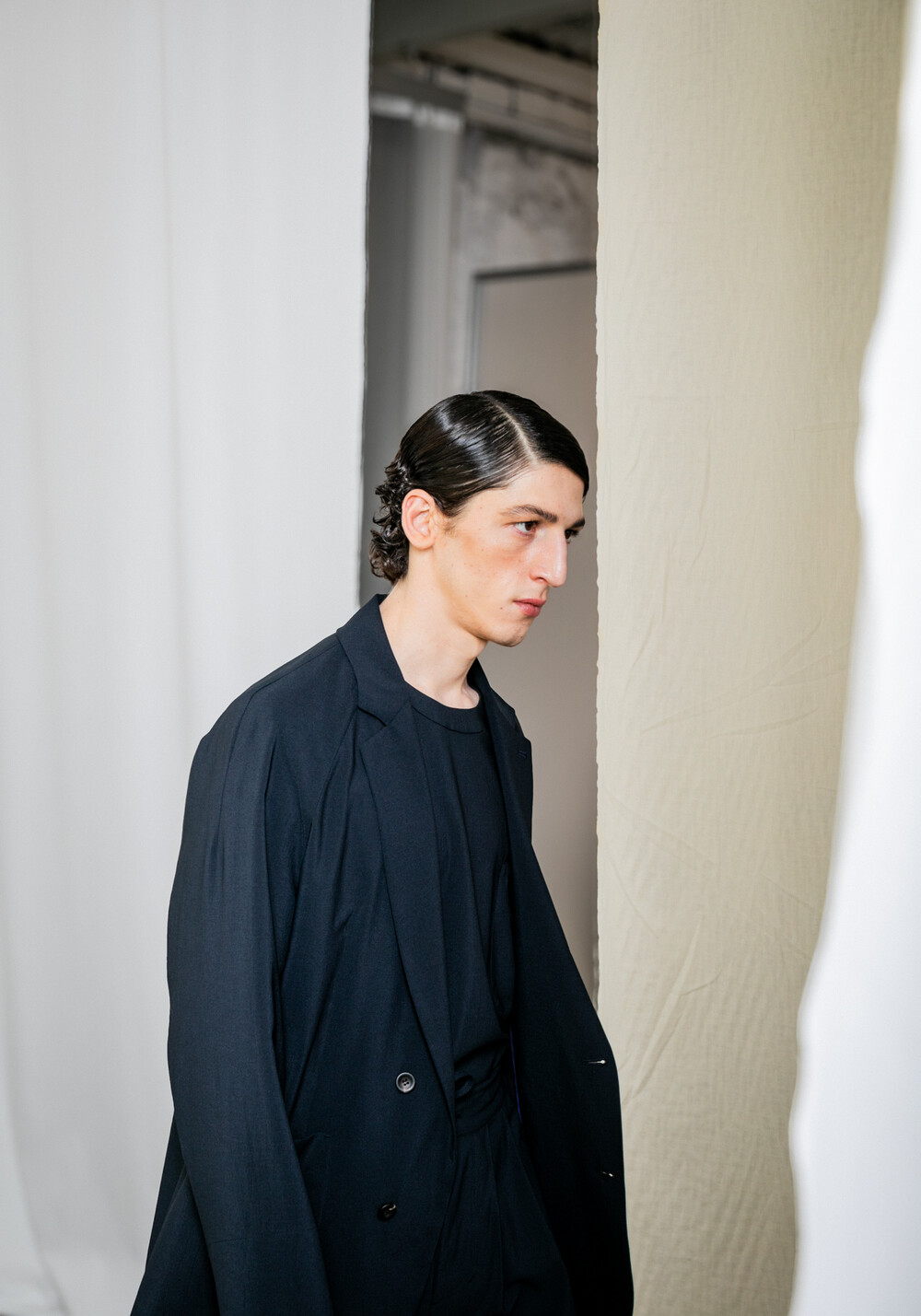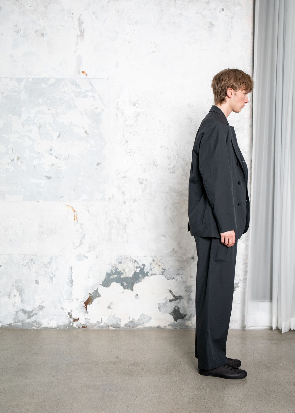 웨이스트라인에서 내려오는 두 개의 턱이 라인을 잡아주어 드레시한 뉘앙스와 함께 허리를 잡아주고, 천연 소뿔 단추로 마감하여 완성도를 높였습니다.