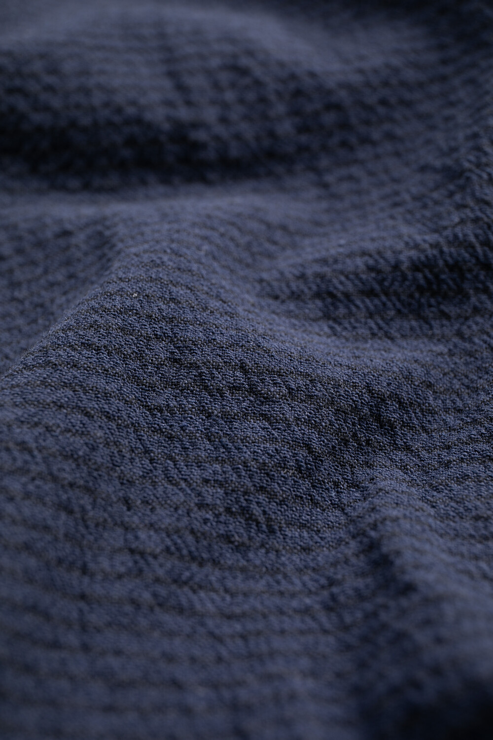 다크네이비와 블루 컬러가 수평으로 교차되며 오묘한 컬러감을 형성하고, 시어서커 본연의 요철감과 아름답게 조화를 이룹니다.