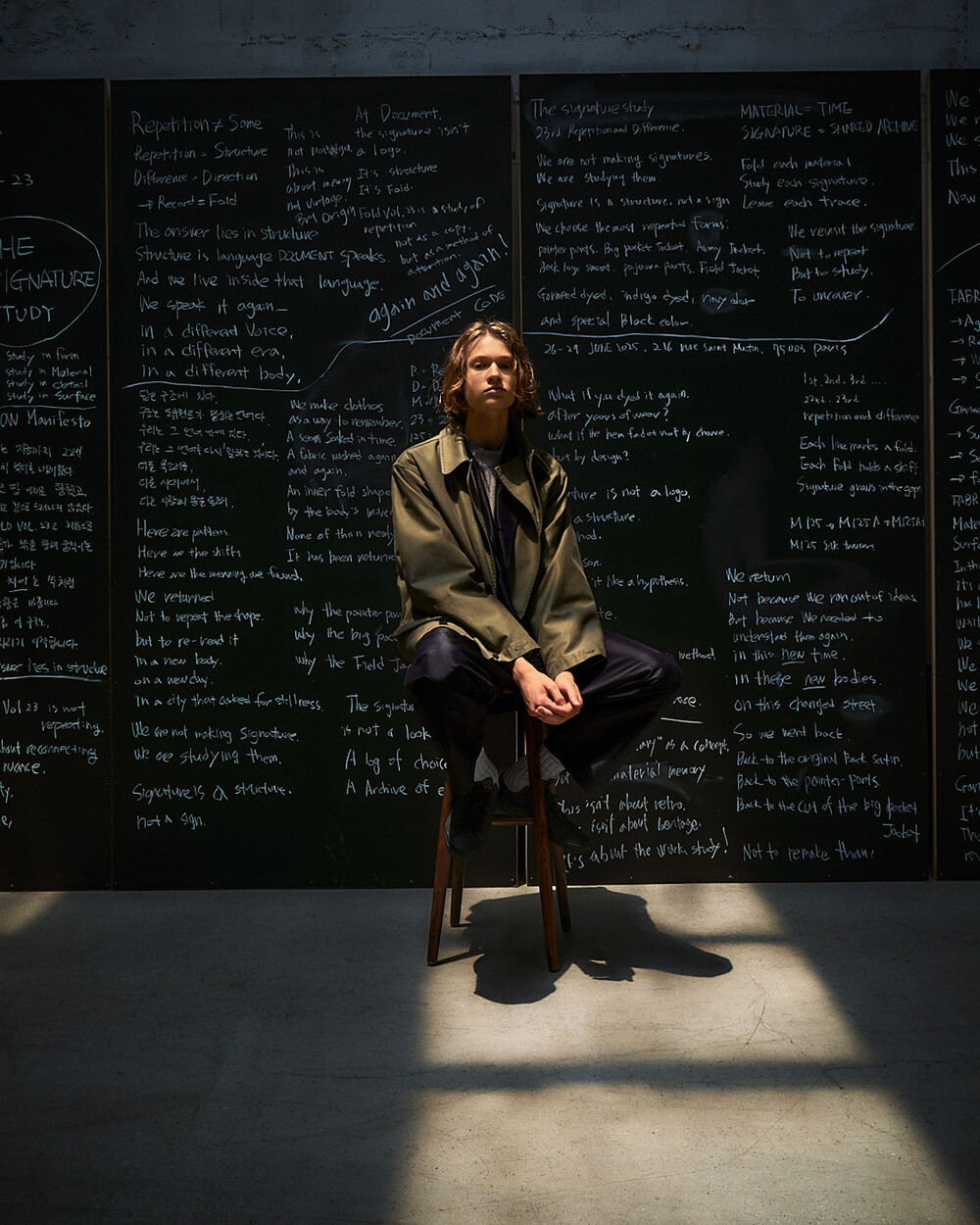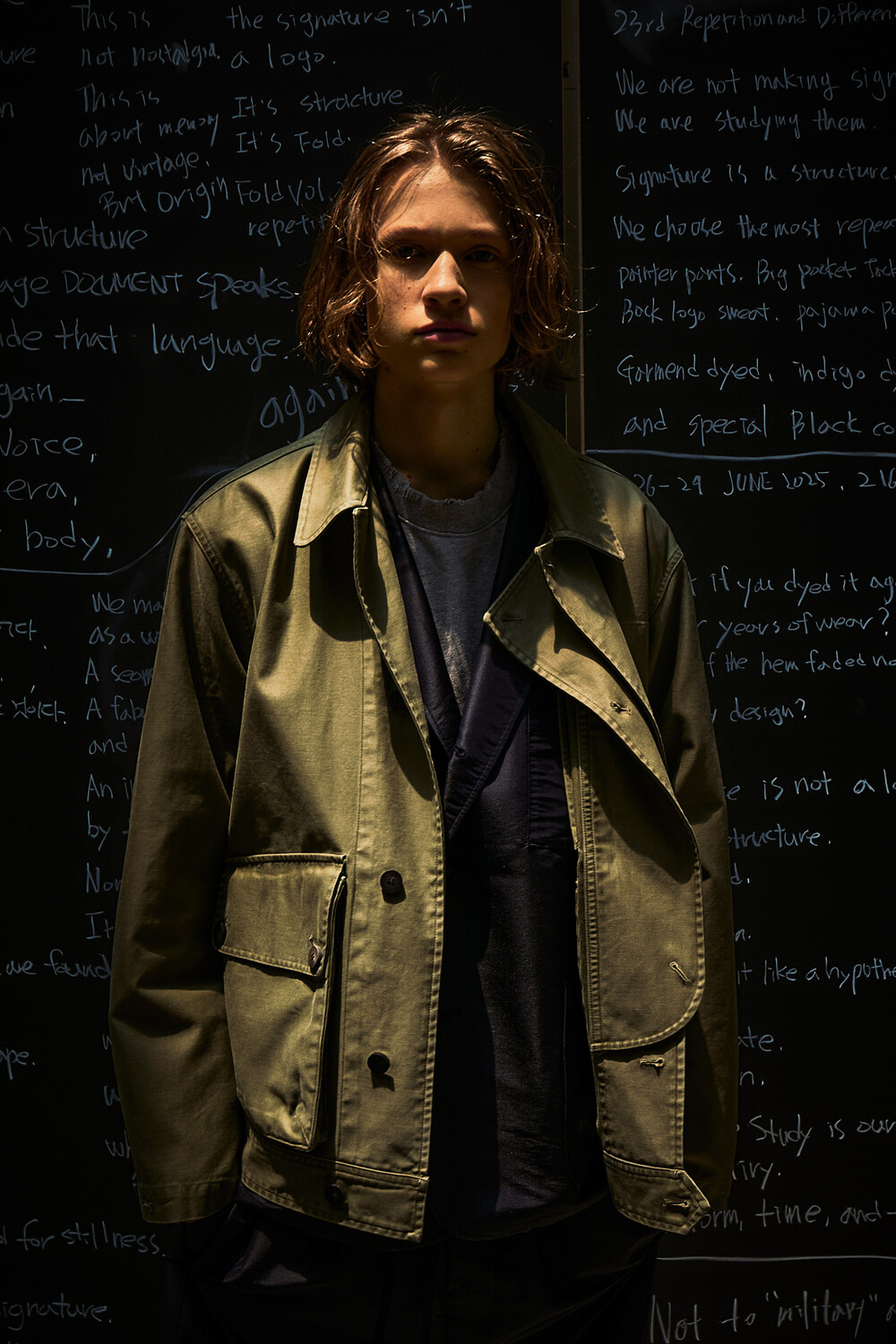 This piece reinterprets DOCUMENT’s signature Big Pocket Jacket with a slightly different character. While maintaining the familiar structure, the inner placket has been refined with a narrower width to reduce bulk, allowing the jacket to be worn either fully buttoned for a clean look or left naturally open for a more relaxed expression.
