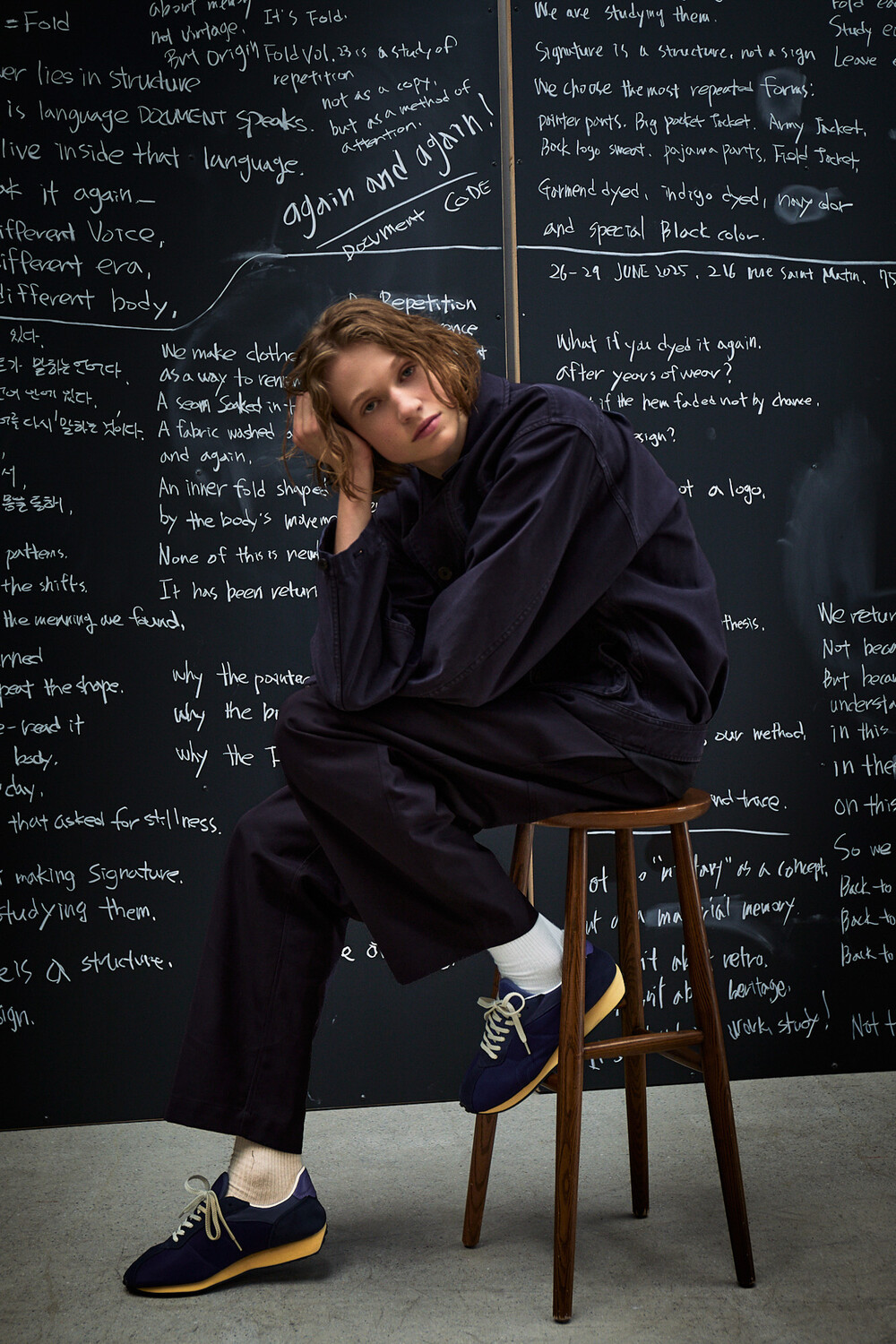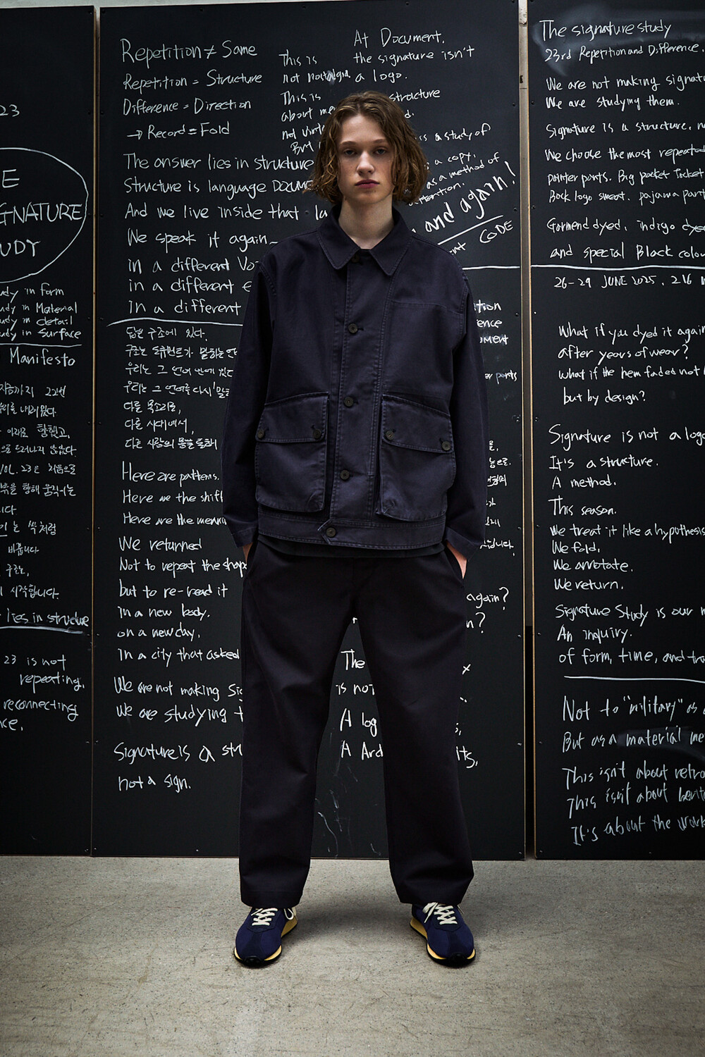 This piece reinterprets DOCUMENT’s signature Big Pocket Jacket with a slightly different character. While maintaining the familiar structure, the inner placket has been refined with a narrower width to reduce bulk, allowing the jacket to be worn either fully buttoned for a clean look or left naturally open for a more relaxed expression.