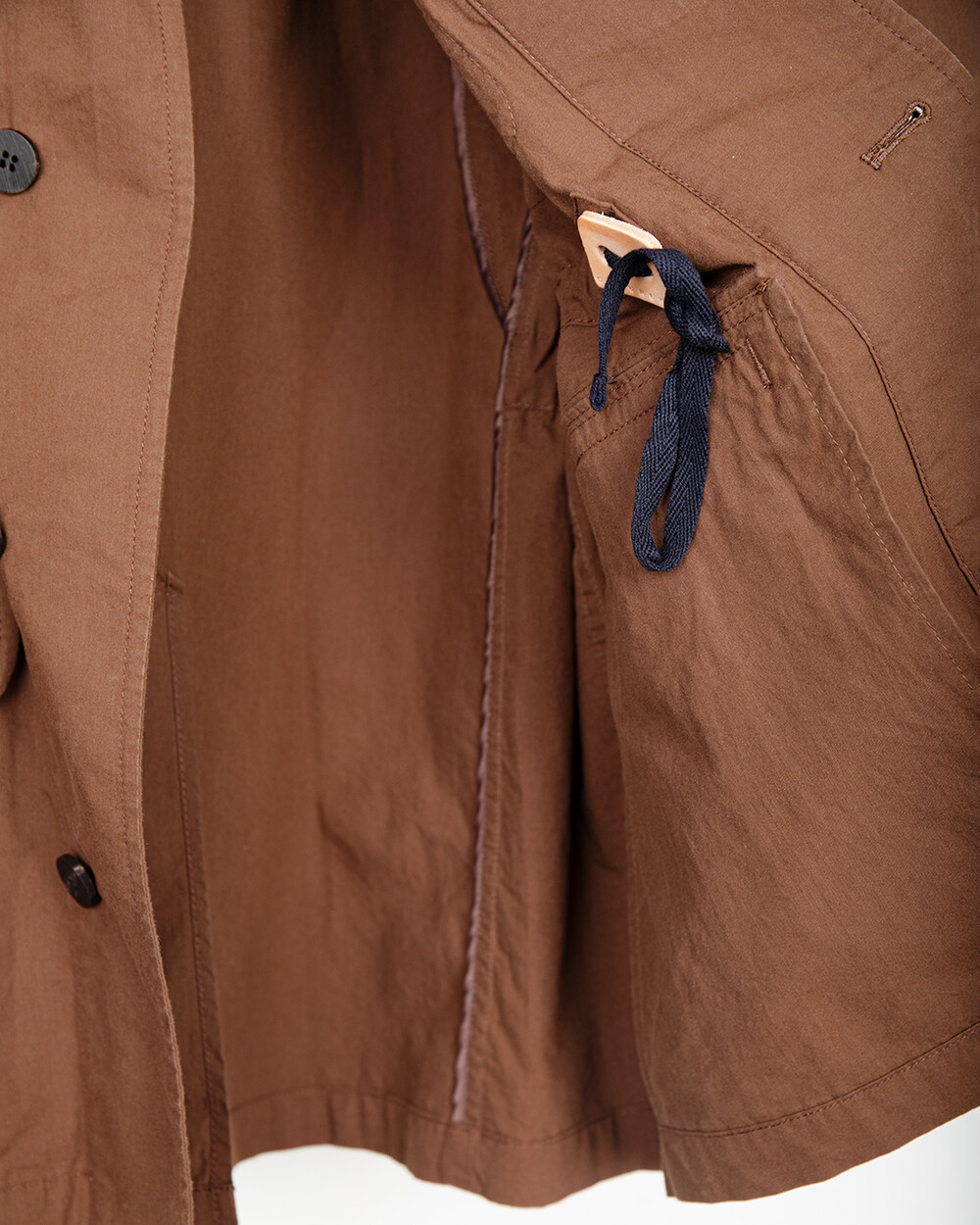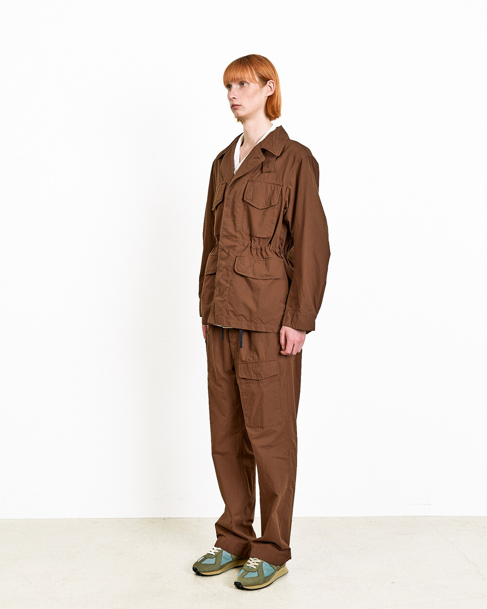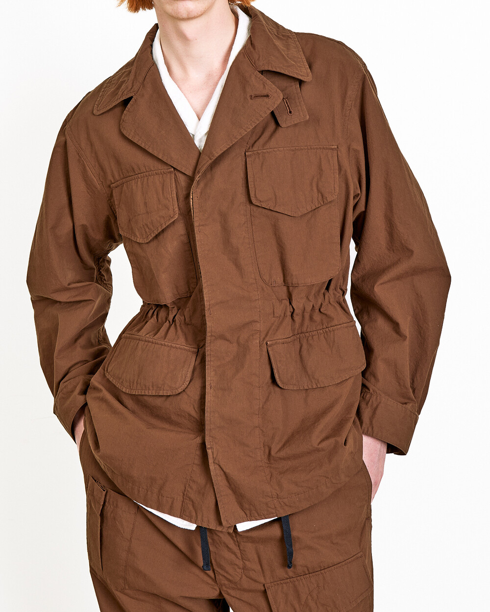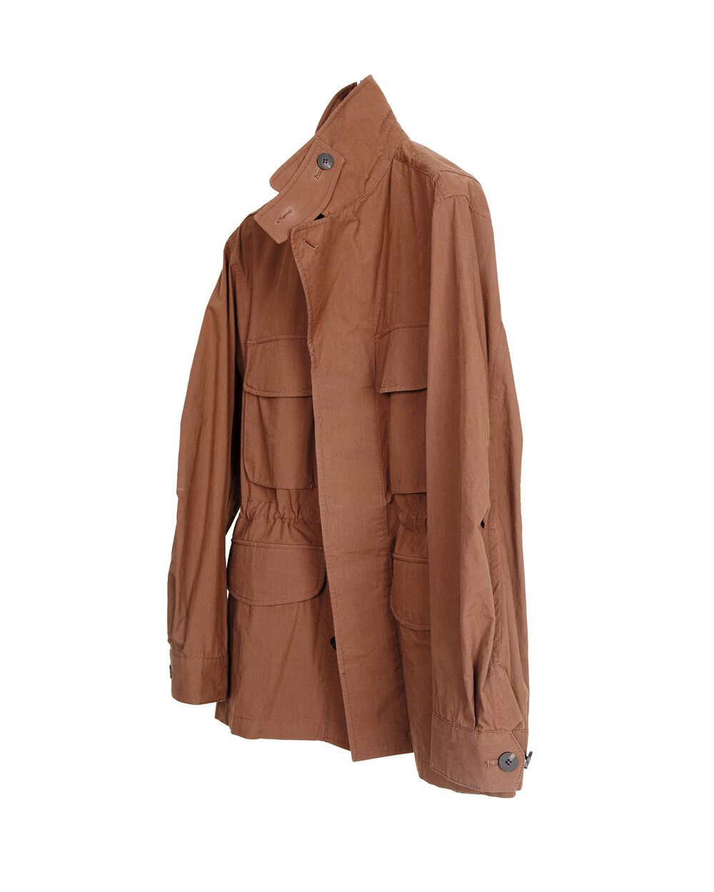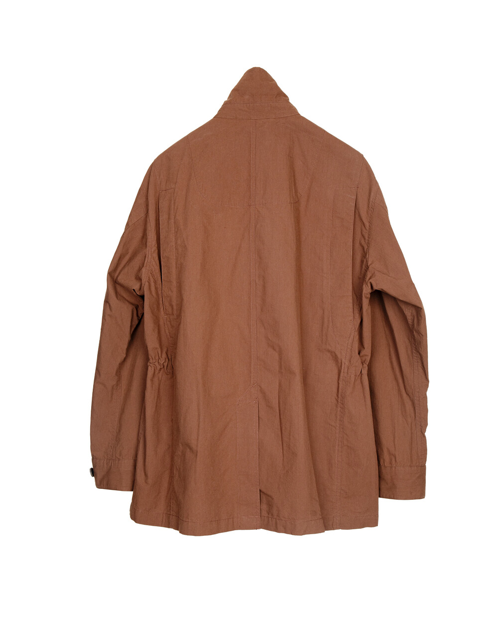 The waist drawstring is positioned at the front, allowing the silhouette to be adjusted, while the back is kept cleaner so it can be worn more like a jacket.The collar can be worn open for a more relaxed expression, or raised for a cleaner, more structured look. Familiar as a field jacket, it is reworked here in a softer and more refined way.