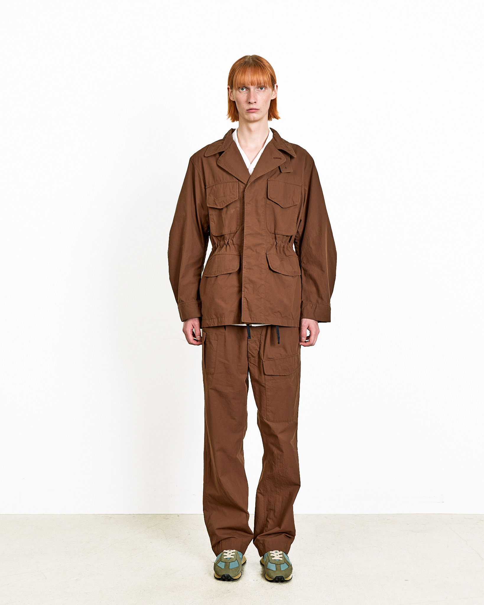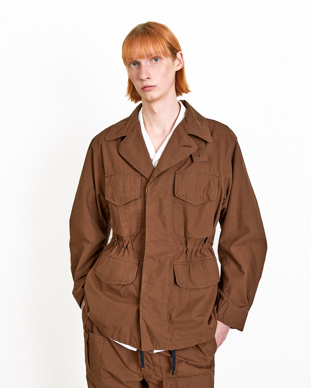 This piece reinterprets the structure of a classic field jacket through DOCUMENT’s own lens.The high stand collar and dimensional pocket construction create a distinctive shape, while the shirring at the waist adds a natural sense of tension and balance to the silhouette.