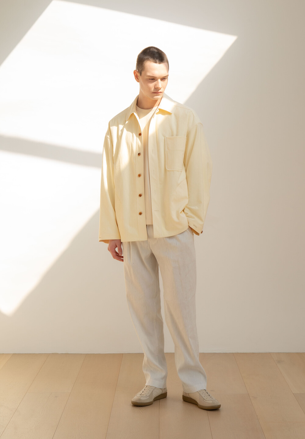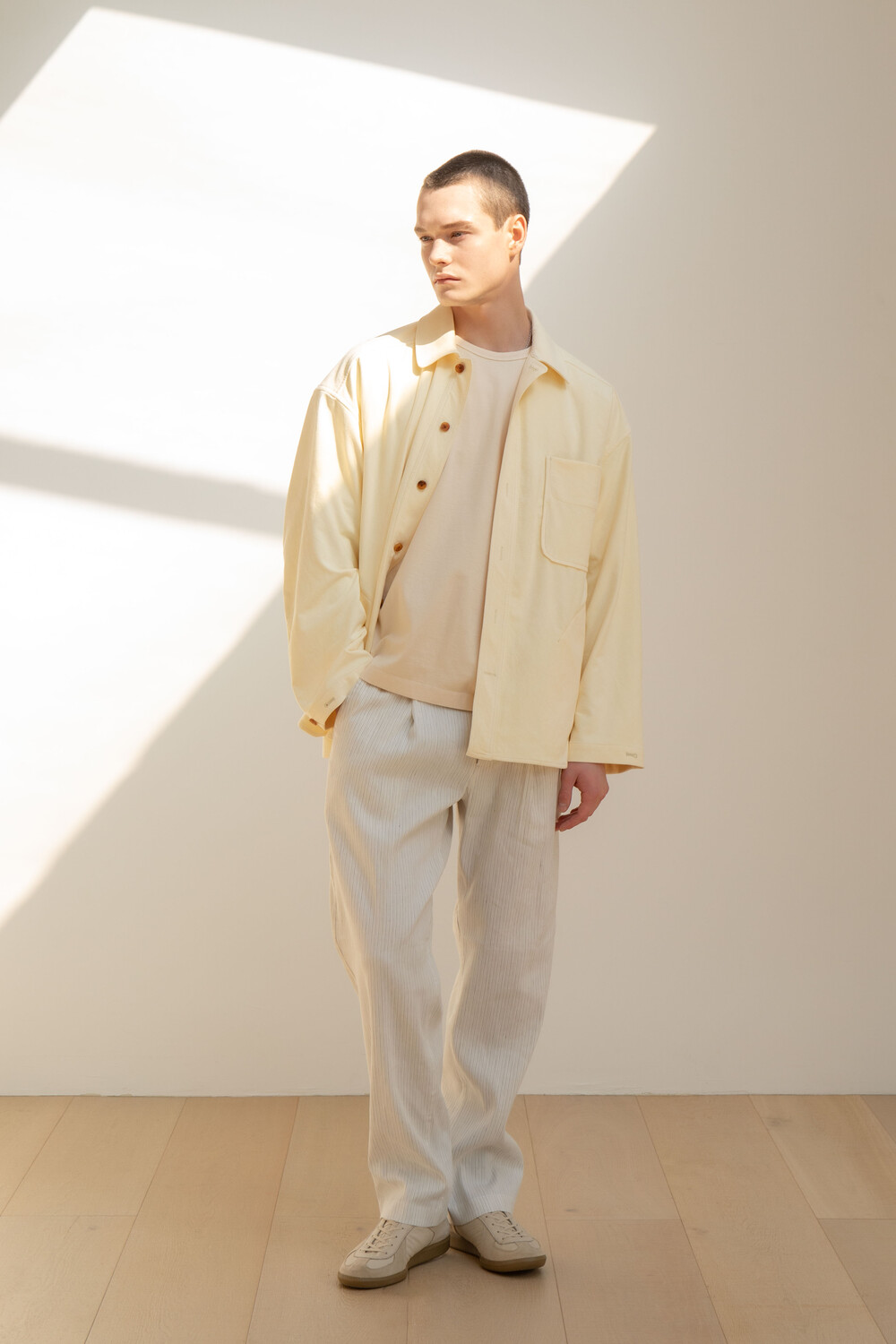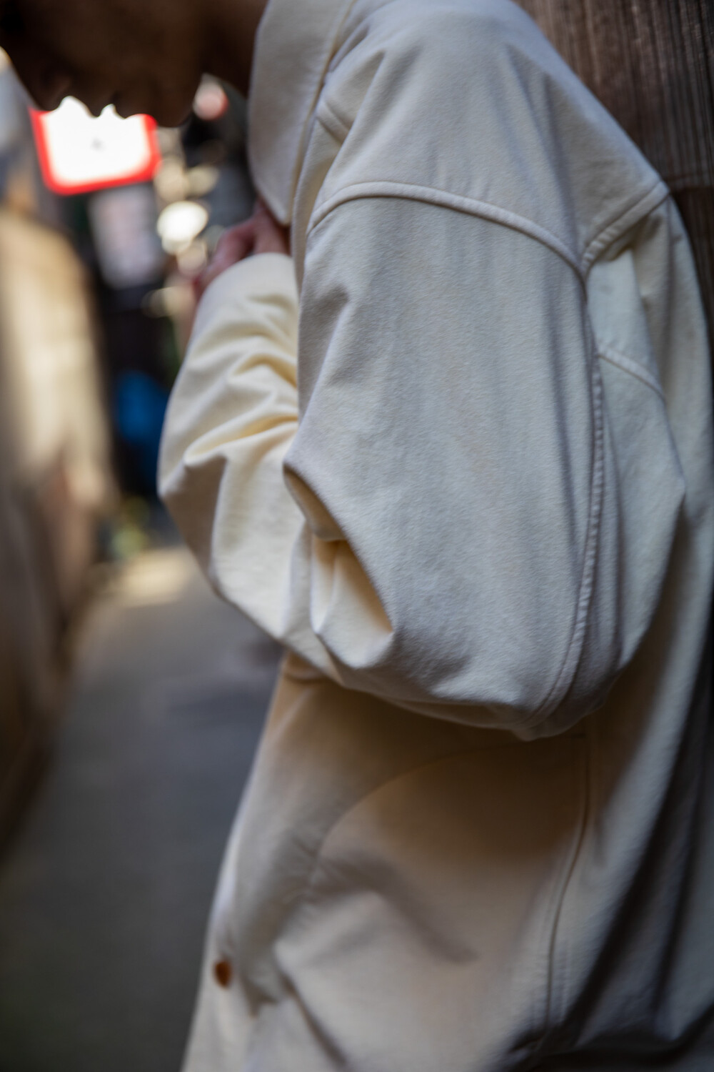 시각적 쾌감을 불러일으키는 컬러 스웨이드가 매력적인 SHITRING JACKET 의 또 다른 컬러 바세린색상 입니다.