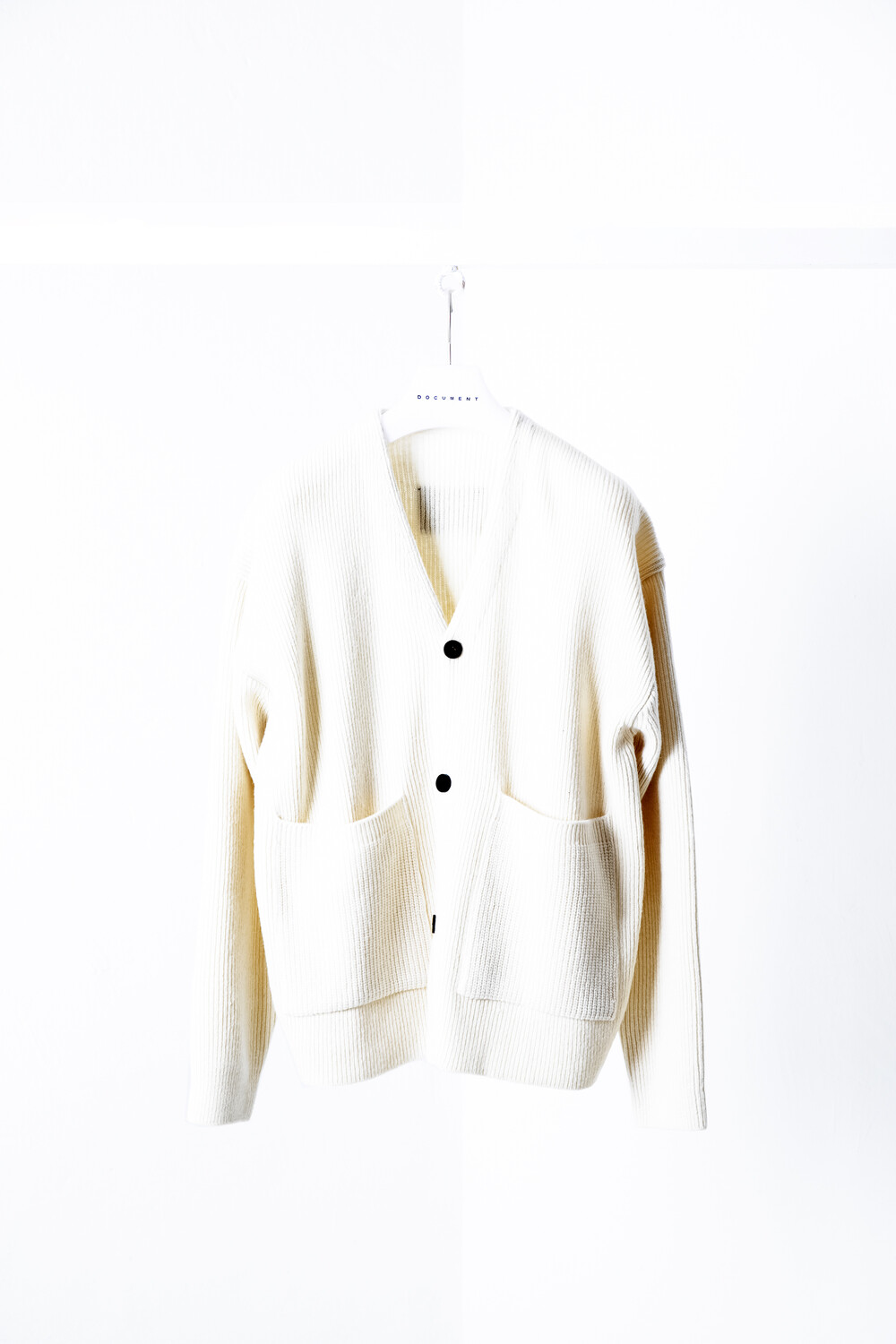 클래식한 V - NECK 가디건을 도큐먼트스럽게 재해석한 디자인으로 루즈한 실루엣을 가지고 있지만, 묵직한 중량감과 큰 포켓 디자인으로 착장시 유니크함을 선사합니다. 리얼 소뿔 단추와 원사의 조합이 돋보이며, 뒤에 수작업으로 단 메인라벨은 아우터로 입었을때, 그 존재감을 드러냅니다.