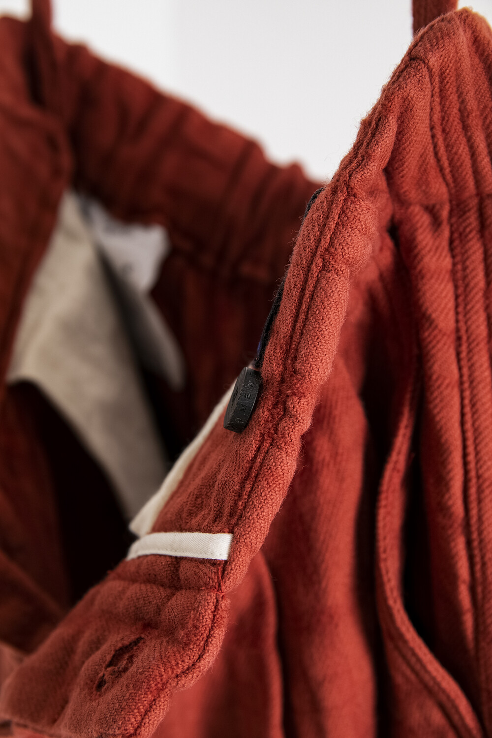 벽돌 컬러 속으로 보이는 타탄 체크 무늬의 패턴또한 매력적인 바지입니다.