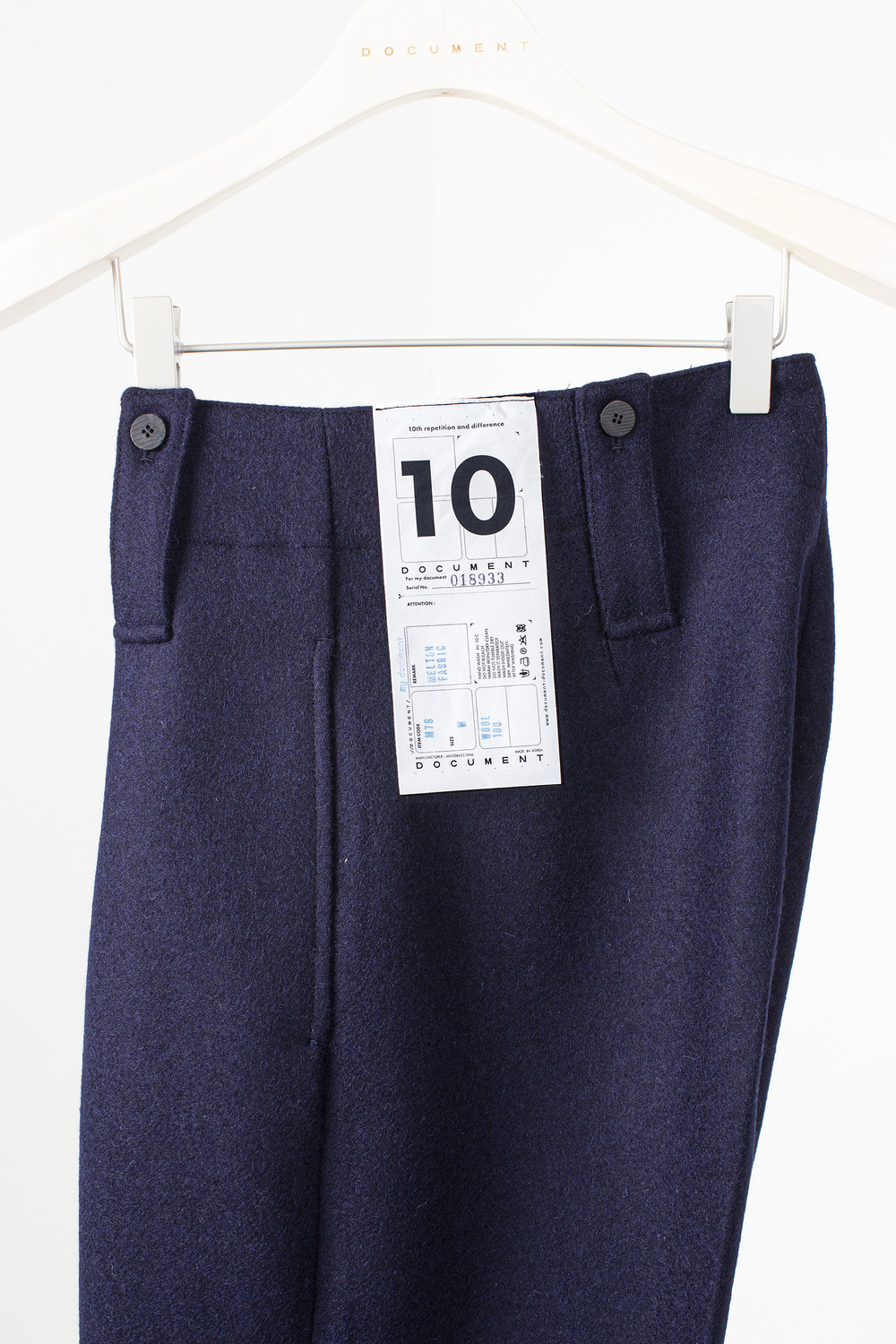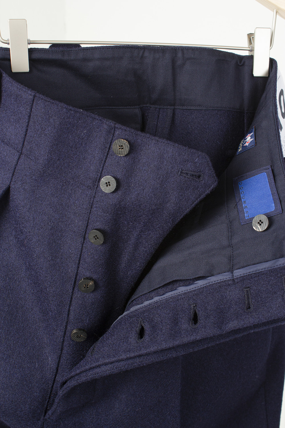 보통 바지보다는 허리선이 높게 올라온 것이 특징이며, 버튼 플라이 작업으로 되어 있습니다. 밑단에는 바지단을 조금 조일 수 있는 비조가 달려 있습니다.