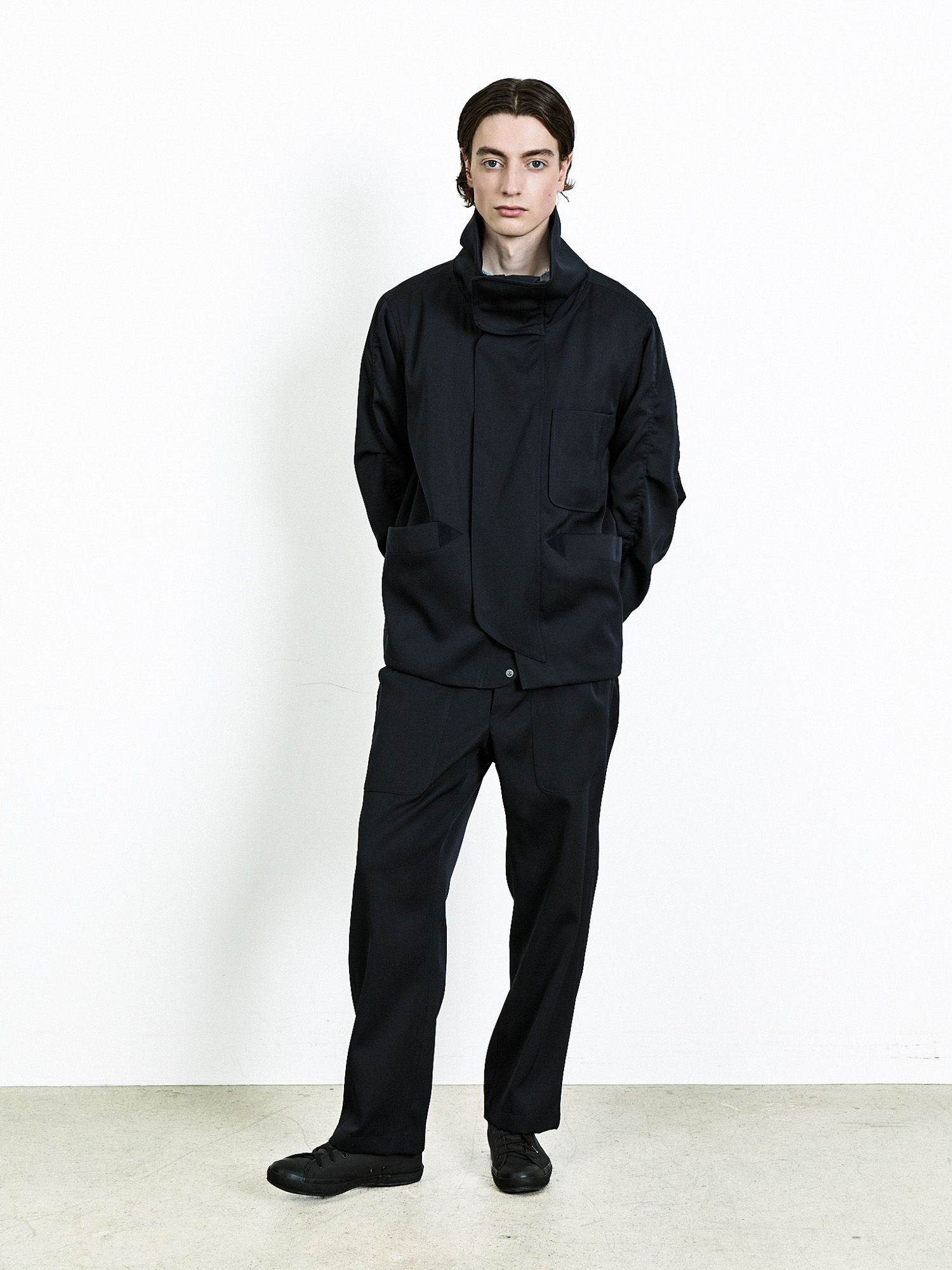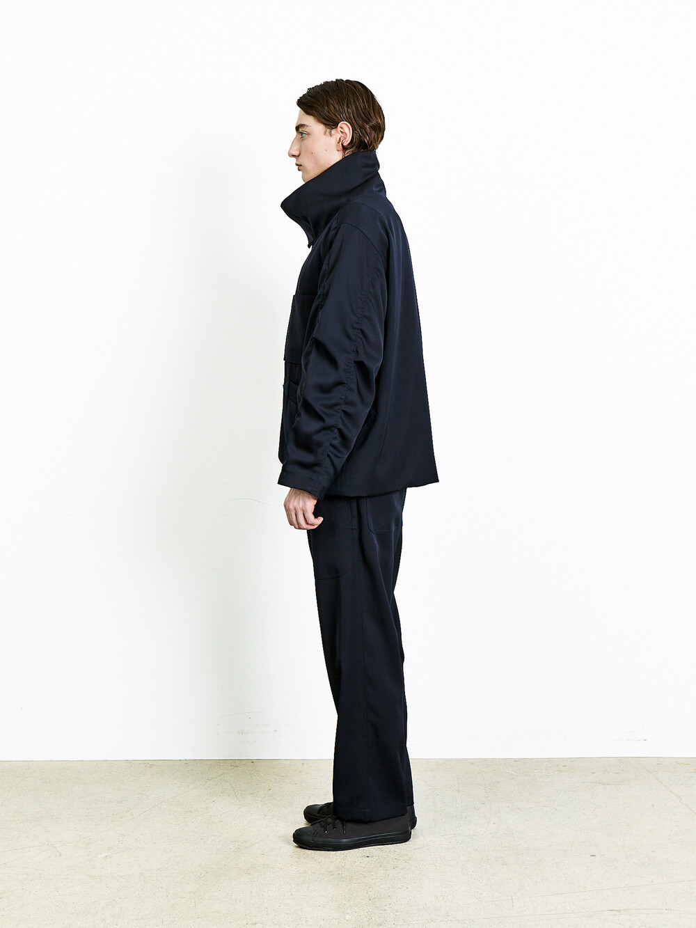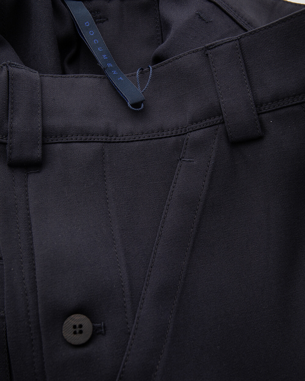 Crafted from a Japanese fabric blend of 99% wool and 1% nylon, this piece expands on the impression of the back sateen cotton previously seen in Document’s fatigue pants, this time reworked in a wool satin version. The fabric has a substantial weight and body, while retaining the natural drape unique to wool. At the same time, it holds a certain hardness on the surface, allowing the silhouette to stay composed and structured. This contrast between softness and firmness is what makes the fabric especially distinctive.