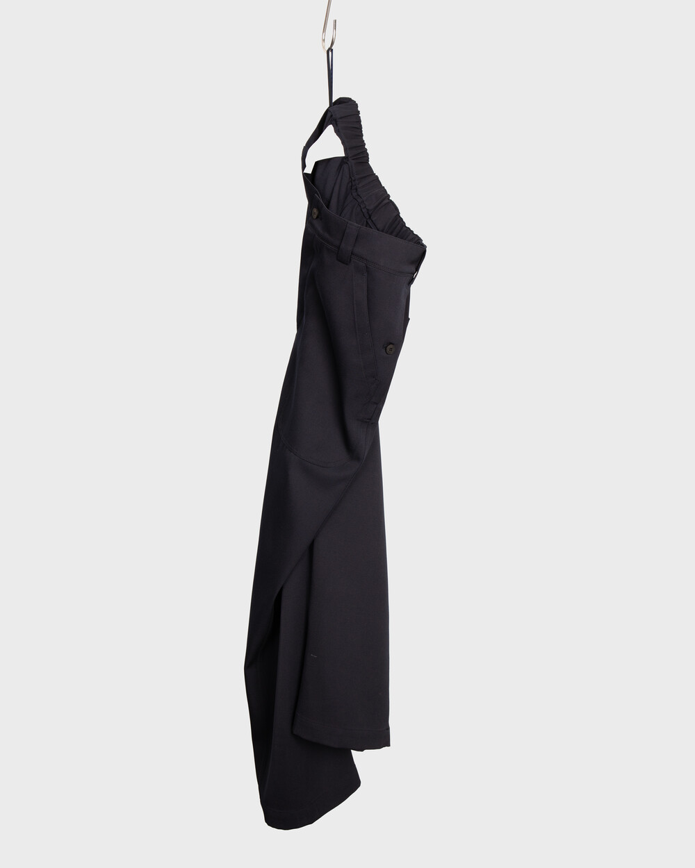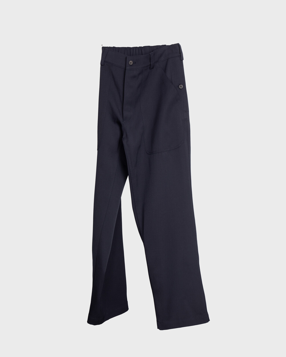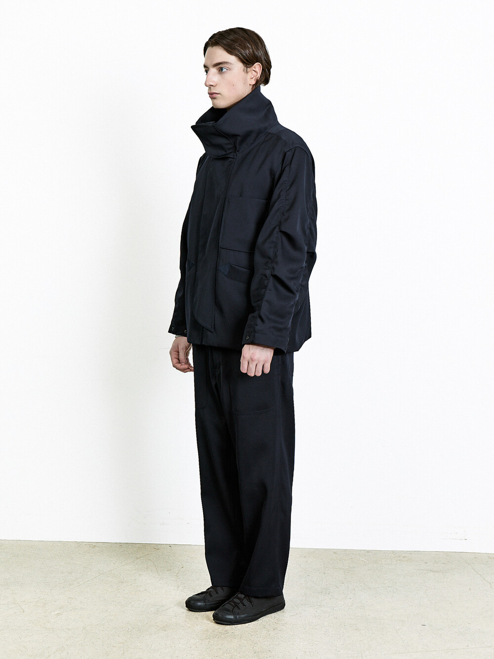 Crafted from a Japanese fabric blend of 99% wool and 1% nylon, this piece expands on the impression of the back sateen cotton previously seen in Document’s fatigue pants, this time reworked in a wool satin version. The fabric has a substantial weight and body, while retaining the natural drape unique to wool. At the same time, it holds a certain hardness on the surface, allowing the silhouette to stay composed and structured. This contrast between softness and firmness is what makes the fabric especially distinctive.