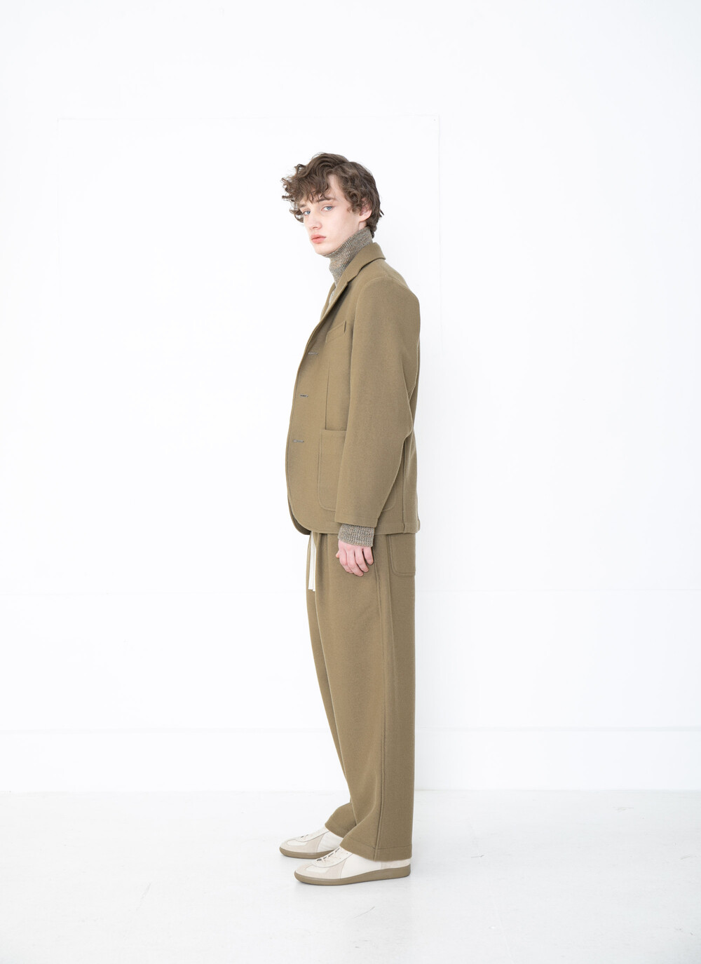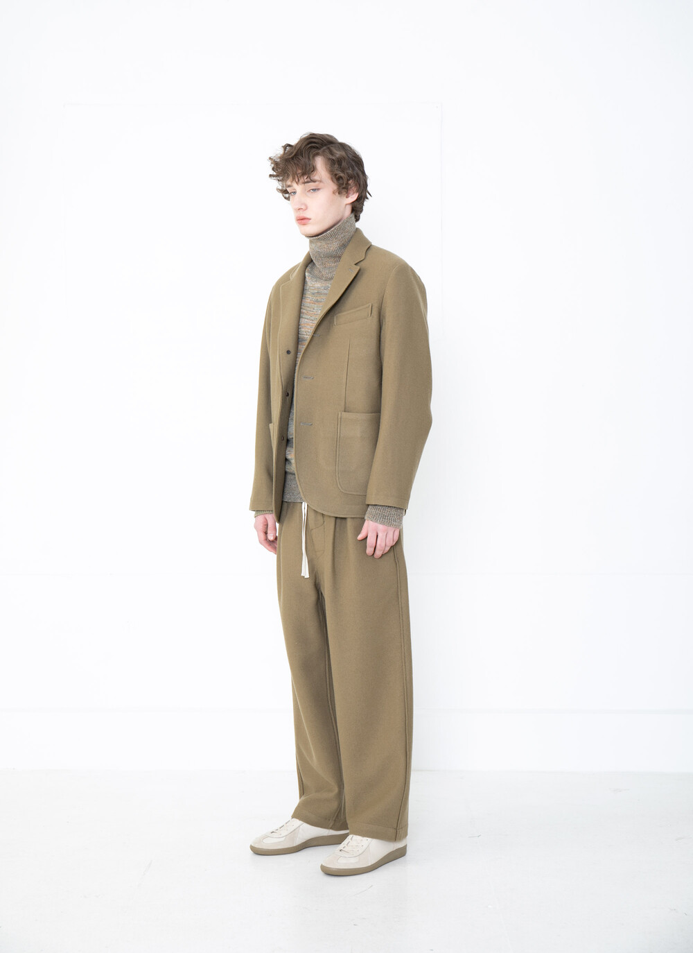 기장 그리고 품과 소매를 비롯하여 전체적으로 넉넉하게 제작되었으며 롤링 라펠, 유려하게 이어지는 어깨 곡선, 테일러드 된 소매 가 특징입니다.