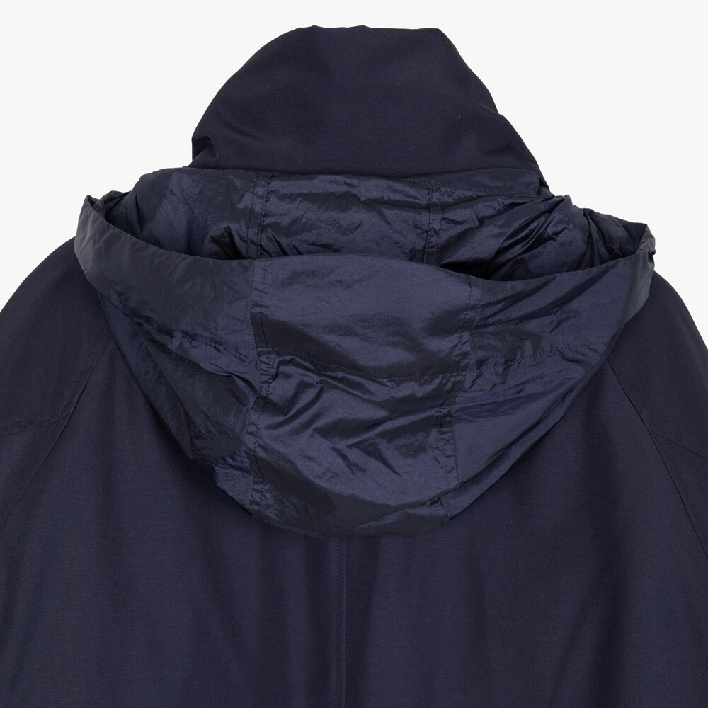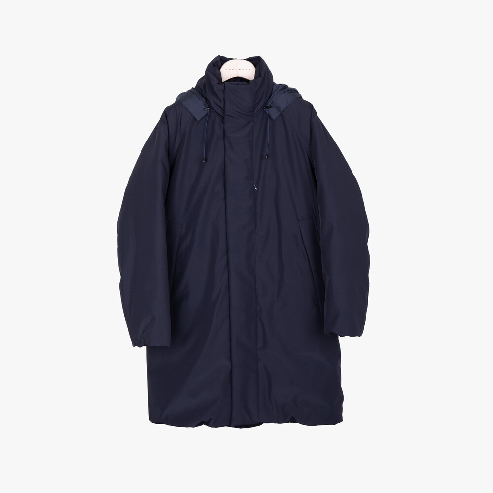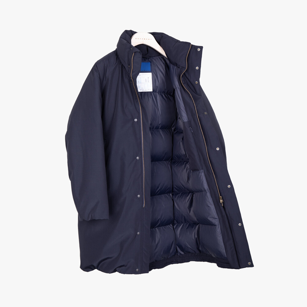 Crafted from a water-repellent Japanese poly-wool blend fabric, this coat provides reliable comfort even in wet winter conditions.Filled with high-quality white goose down (90/10), it offers exceptional warmth while remaining lightweight and structured.
