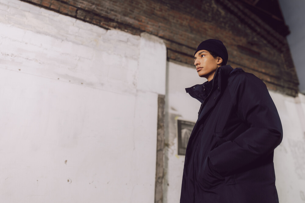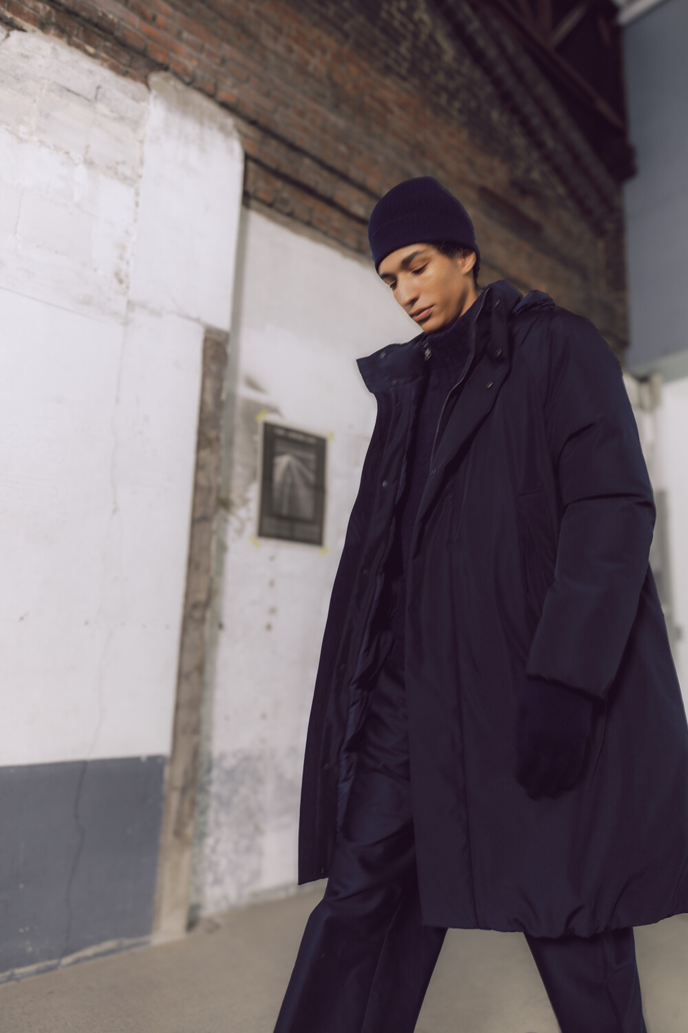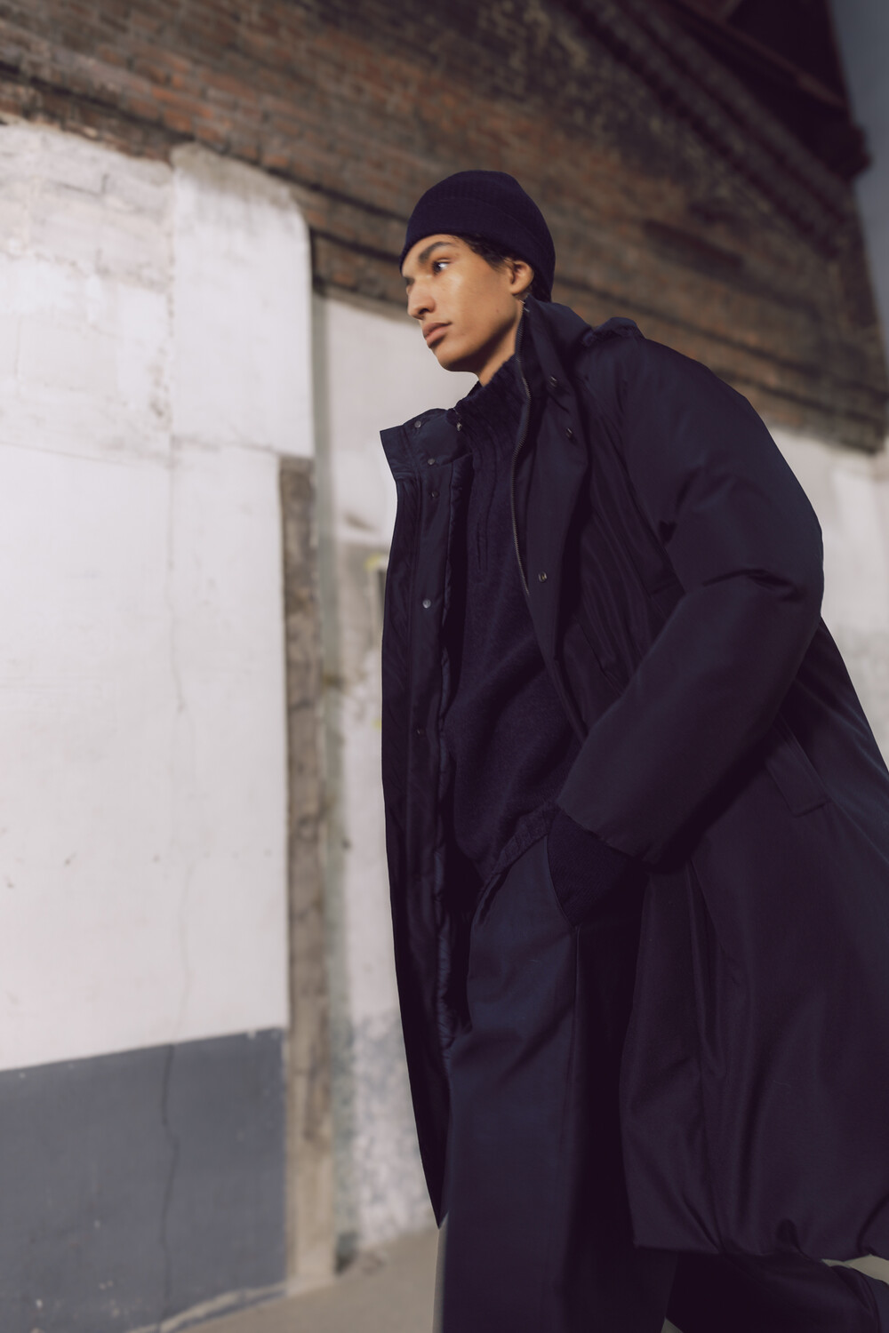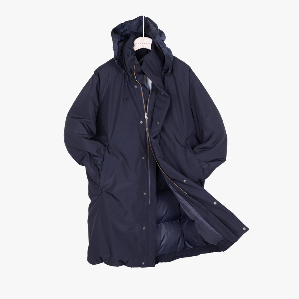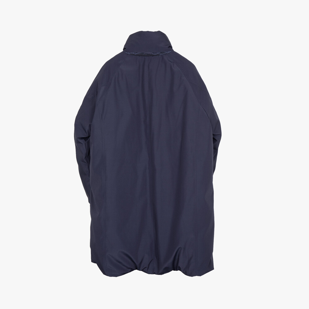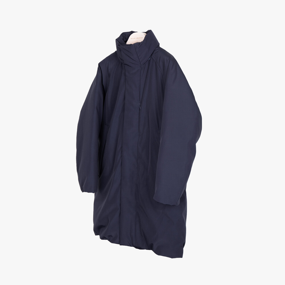 Minimal in appearance with hidden snaps and a two-way zipper, the coat allows for adjustable silhouette through the drawstring hem.It combines the refined look of a wool coat with the lightweight comfort of a down jacket,making it a practical yet elegant outerwear piece for winter.
