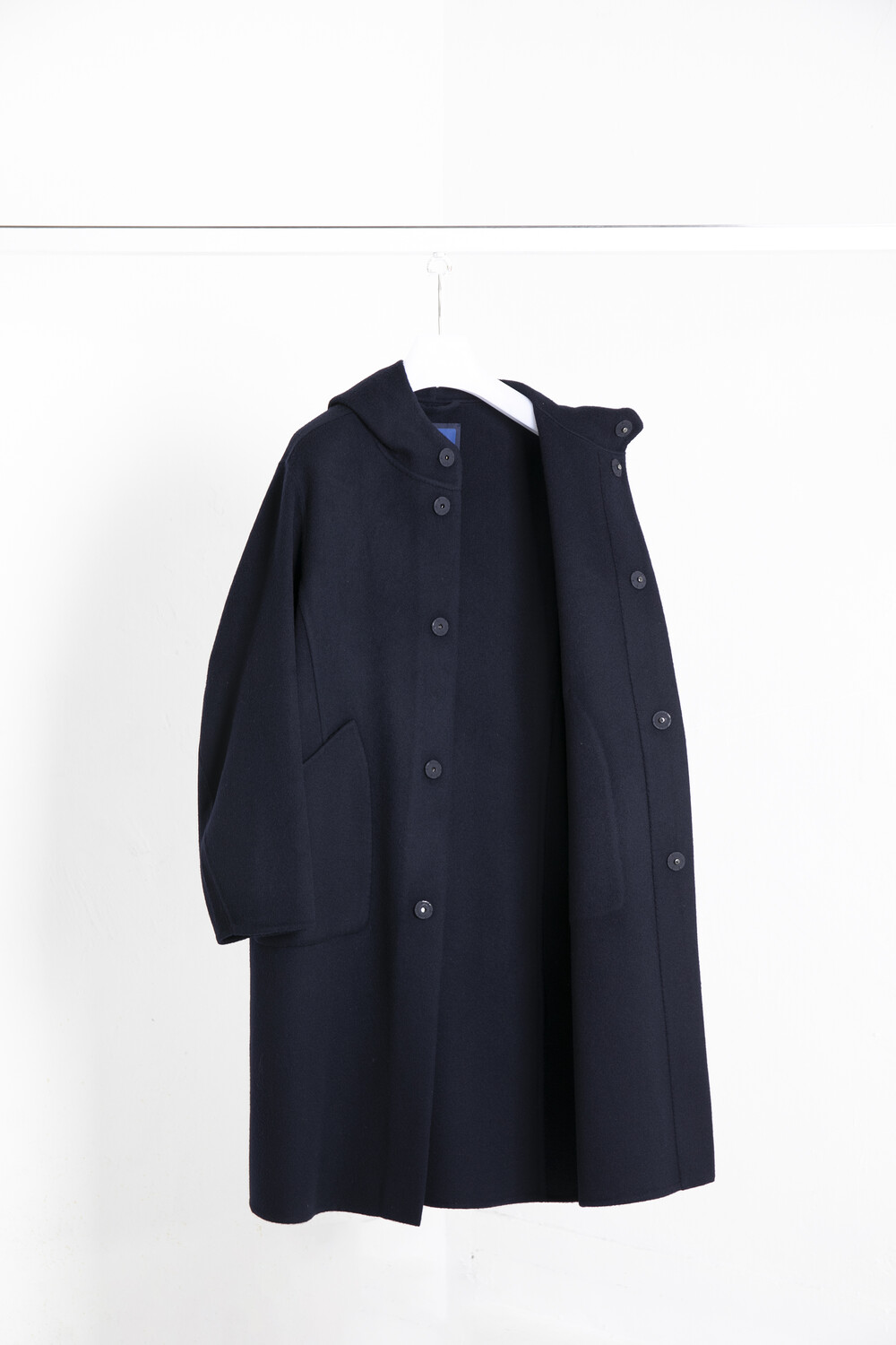 유려한 실루엣을 가지고 있는 후드가 있는 롱 코트입니다. 봉제에서 라벨과 스냅 버튼 부착까지 전 과정이 핸드 메이드로 이루어졌습니다. 착용감을 좋게 하기 위해 소매 안감은 큐프라 안감이 어깨까지만 핸드 스티치로 적용되었습니다, 앞판에 패치 포켓이 2개 있으며, 조금 위에 달린 듯 하여 단순함에서 오는 심플함에서 절묘한 리듬감을 선사합니다.후드 코트는 긴 기장의 밸런스를 위하여 큰 사이즈의 후드와 팔을 들어도 옷이 딸려오지 않는 캐주얼한 소매 각도가 큰 특징입니다. 소매는 살짝 걷어 올리면 , 특유의 소매 라인( 위는 크지만, 아래로 급격히 좁아드는) 이 살아나 도큐먼트 만의 후드 코트 실루엣을 느끼실 수 있습니다.