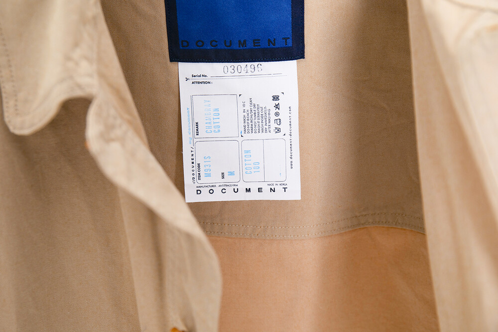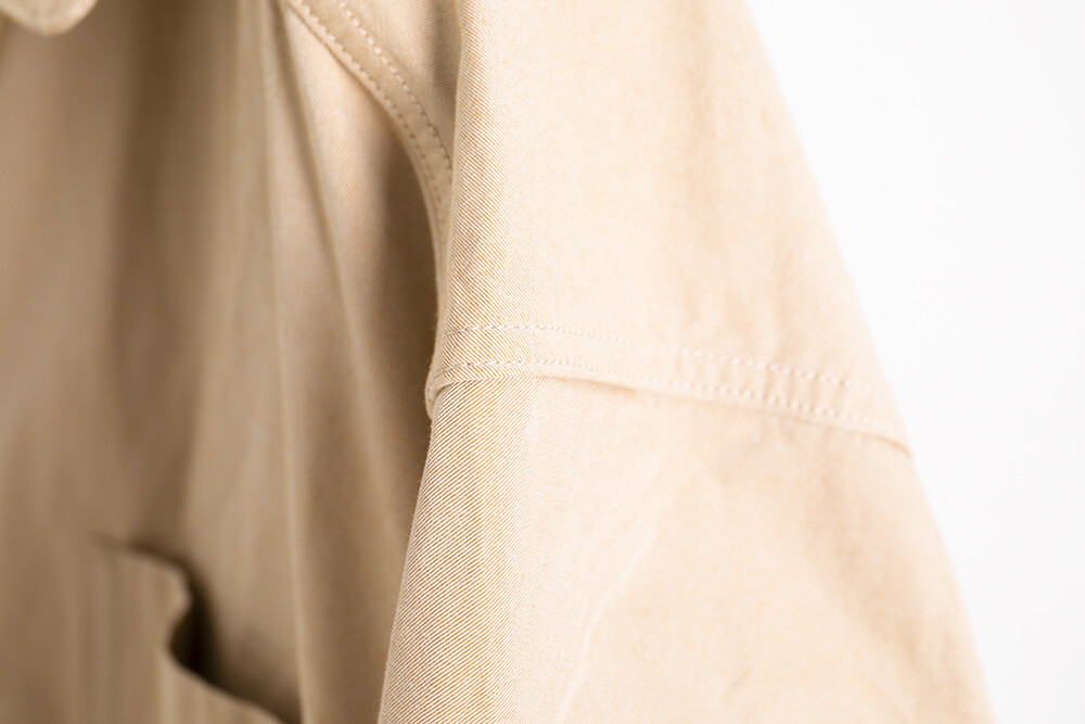 이번 시즌 선보인 OXFORD SHAMBRAY SHIRTING JACKET 와 같은 스타일로, 커프스없이 시접을 접어박아 마감을 하였으며 밴드와 칼라가 둥글게 굴려져있는 모양을 하는 등 동일한 디테일로 만들어졌습니다.