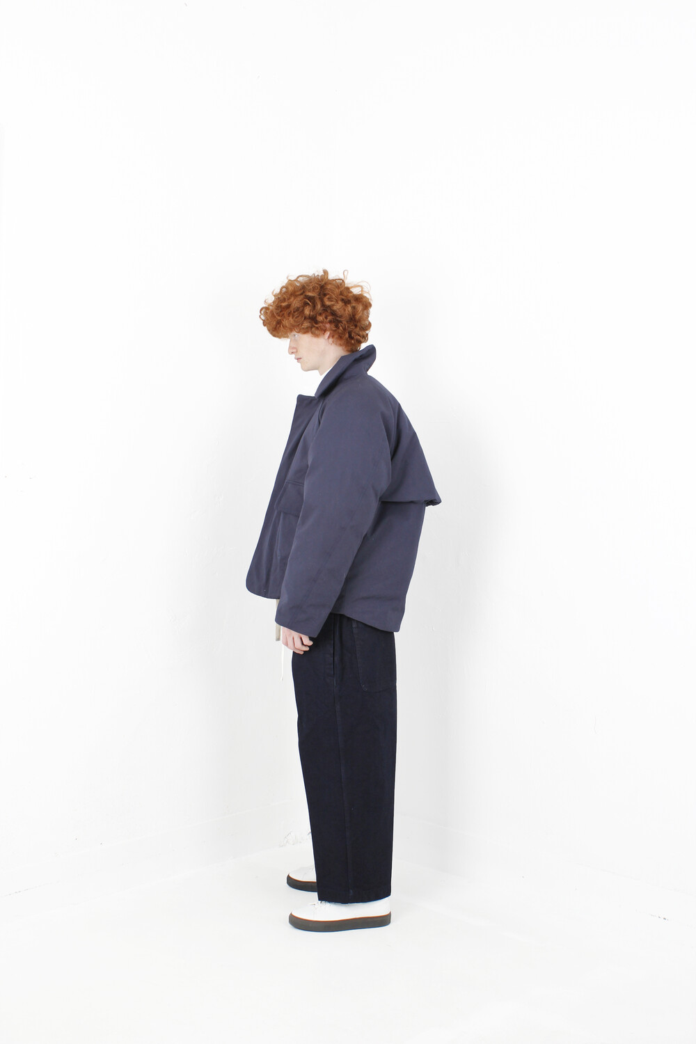 큰 소매가 돌아나오는 앞으로 돌아나오는 패턴과 옆에서 바라보았을때 뒤가 살짝 라운드 지게 보여지는 실루엣이 입었을때 앞과 뒤에 기장의 변화가 자연스러운 건축적라인을 보여줍니다.