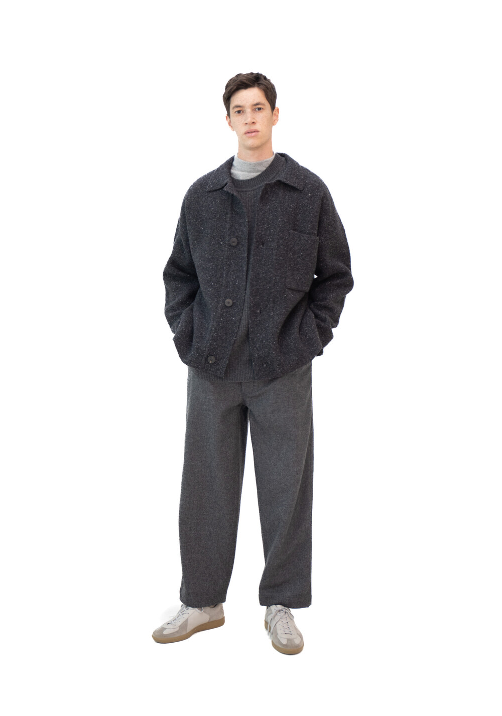 도큐먼트에서 꾸준하게 선보이는 빅포켓 가디건이 열여섯번째 반복과 차이에서는 트위드 원사로 선보입니다.