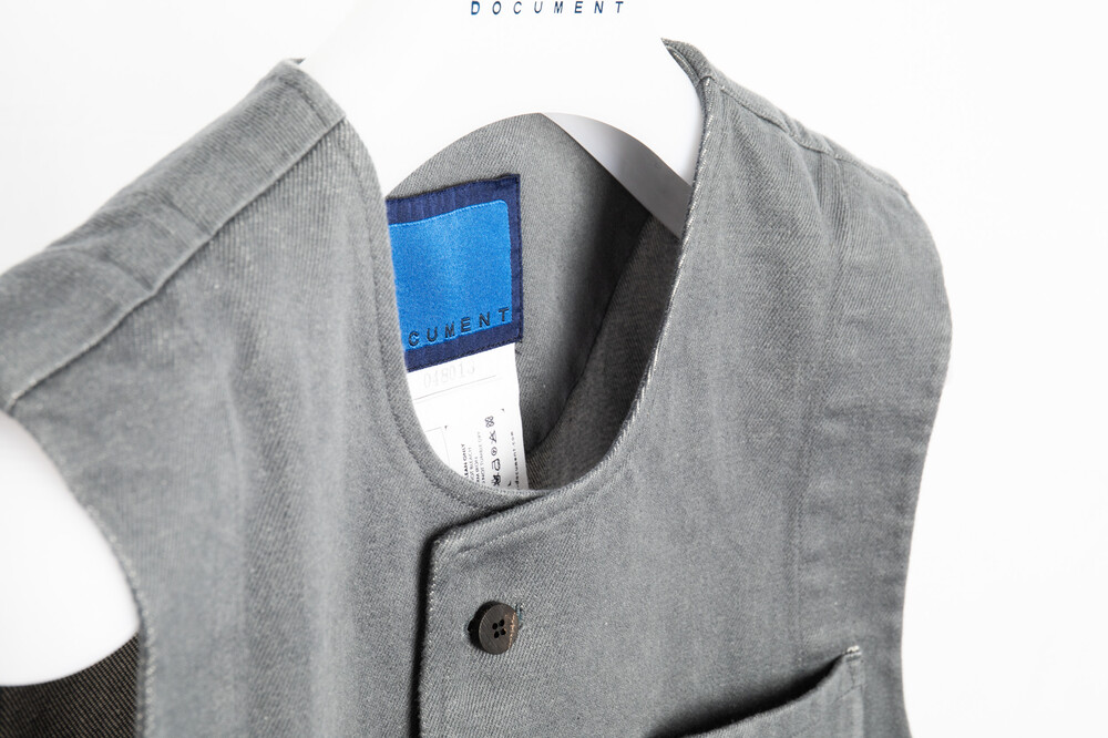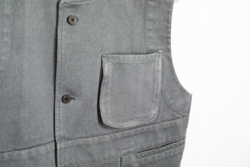 ORGANIC ENGLISH COTTON PAINTER PANTS 와 같은 원단으로 제작된 vest 이며, 워싱 처리가 되어 자연스러운 질감을 표현하고 있습니다.