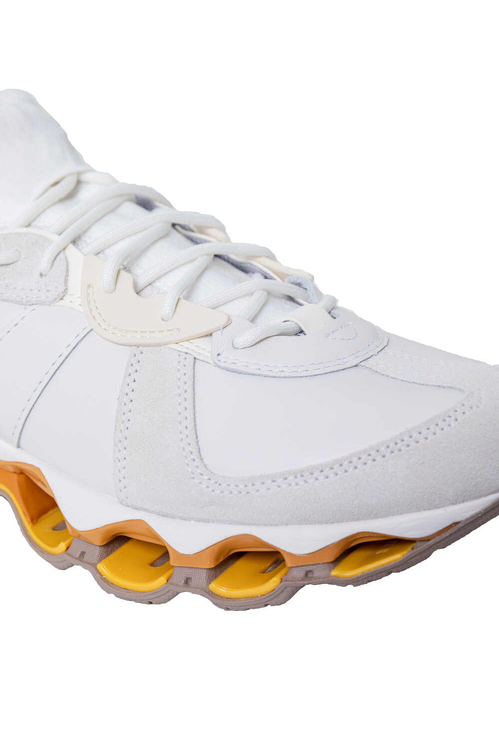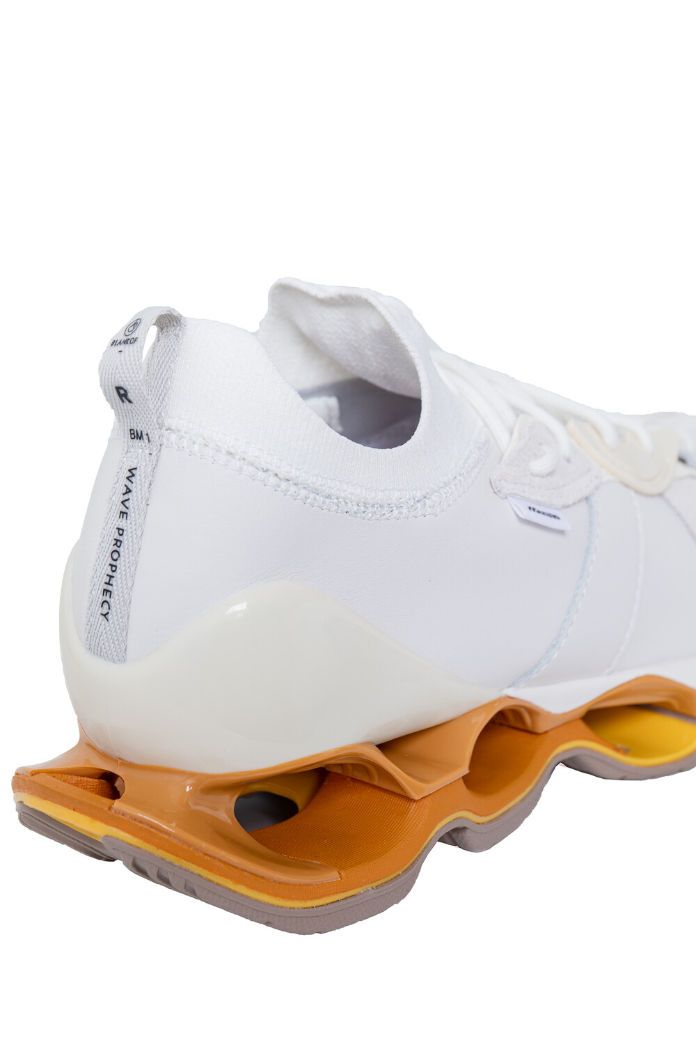 신발 측면의 왼발과 오른발에는 미즈노와 블랭코브 라벨이 서로 각각 다르게 달려있으며 깔창에 표기된 브랜드 로고는 라벨에 명시된 브랜드명과 엇갈려 프린트 되어 있어 한 쪽의 신발만 보더라도 함께 협업한 디자인임을 직관적으로 알 수 있도록 했습니다.